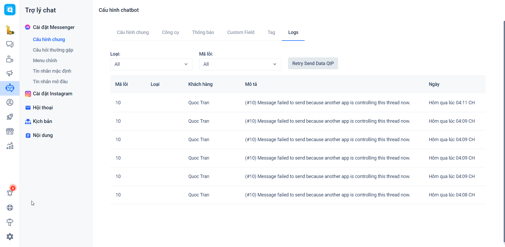 - Những kịch bản chatbot như: kịch bản chăm sóc, trả lời theo từ khóa, xử lý theo điều kiện, tin nhắn mặc định, tin nhắn mở đầu, lời chào hay các kịch bản menu đều sẽ không thể hoạt động. Bạn có thể xem được cảnh báo lỗi "(#10) Message failed to send because another app is controlling this thread now." khi các tin nhắn từ chatbot không gửi được tại **Trợ lý chat →**Cài đặt Messenger → Log: