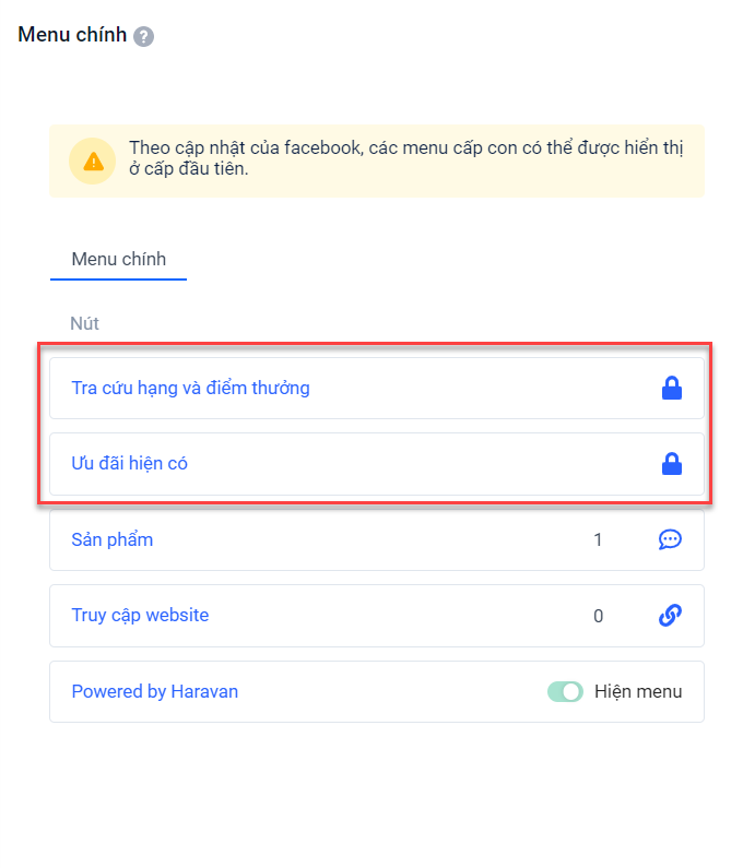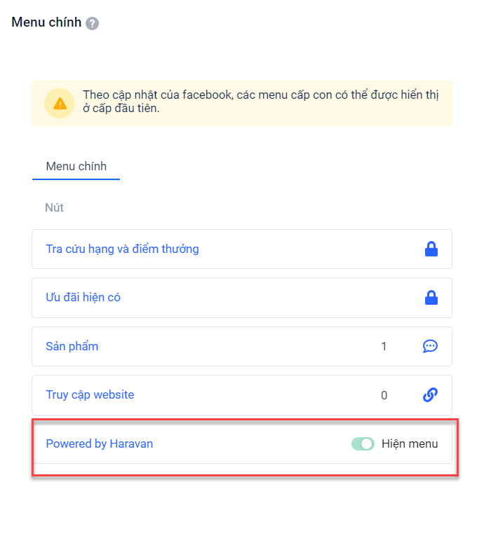 - Menu 'Powered by Haravan' là menu xuất hiện mặc định trên Chatbot. Khi nhấp vào menu này, bạn sẽ được truy cập đến Messenger để chat với Harasocial. Đối với menu này là menu mặc định, bạn không thể chỉnh sửa nội dung và xóa.