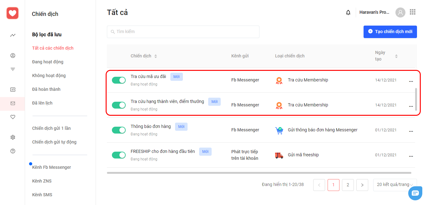 Để có thể ẩn 2 menu này tại menu Messenger, bạn cần tắt kích hoạt 2 chiến dịch này tại hệ thống Loyalty.Cách thiết lập và bật/tắt kích hoạt chiến dịch tra cứu hạng thành viên, ưu đãi của Loyalty, bạn có thể xem thêm***tại đây**.***