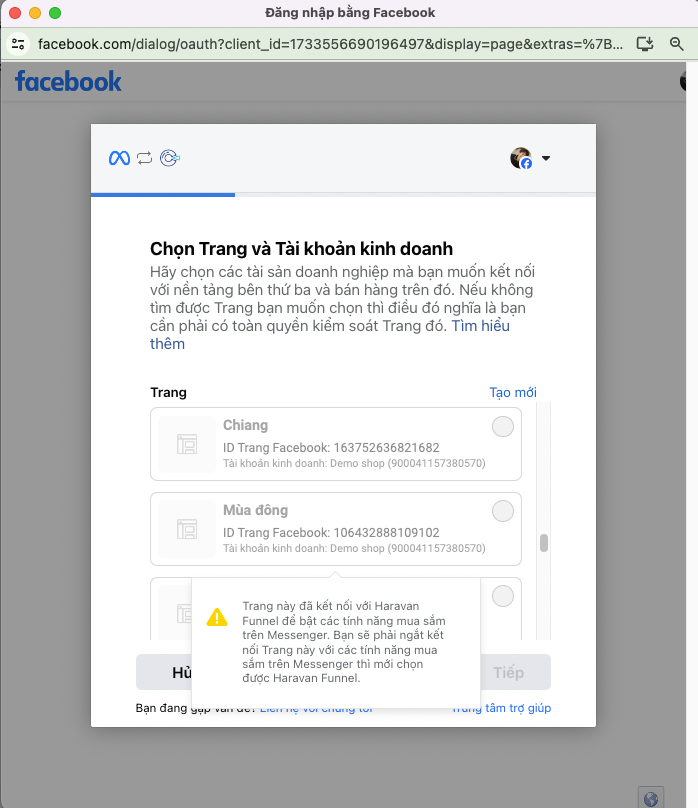 Ví dụ: trang Cái bình nước nằm trong tài khoản business “Demo Shop” và “Châu Như". Trước đó bạn đã kết nối tài khoản business “Demo shop” và trang “Cái bình nước” vào Harasocial. Sau đó bạn dùng tài khoản business Châu như kết nối trang “Cái bình nước" với Harasocial sẽ báo lỗi như hình.