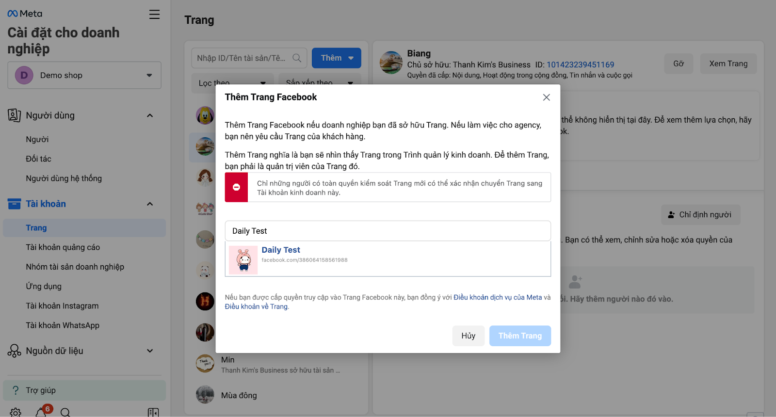 - Cách khắc phục: Cần kiểm tra xem trang muốn kết nối đã thuộc tài khoản Business chọn kết nối chưa và thêm trang vào Business, sau đó phân quyền vào tài khoản có toàn quyền quản lý trang.