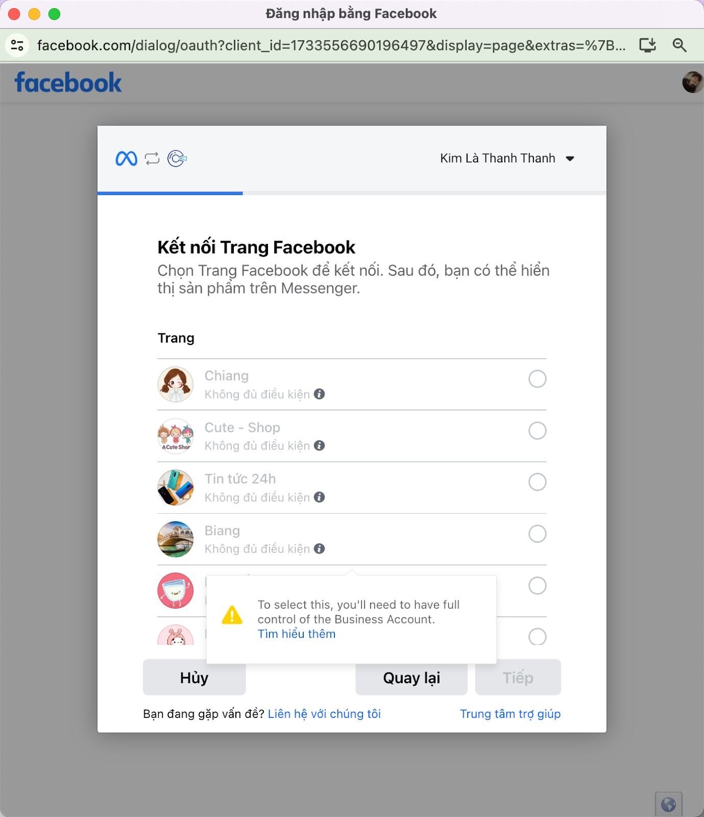 - Tài khoản Facebook Business không đủ quyền kết nối trên trang