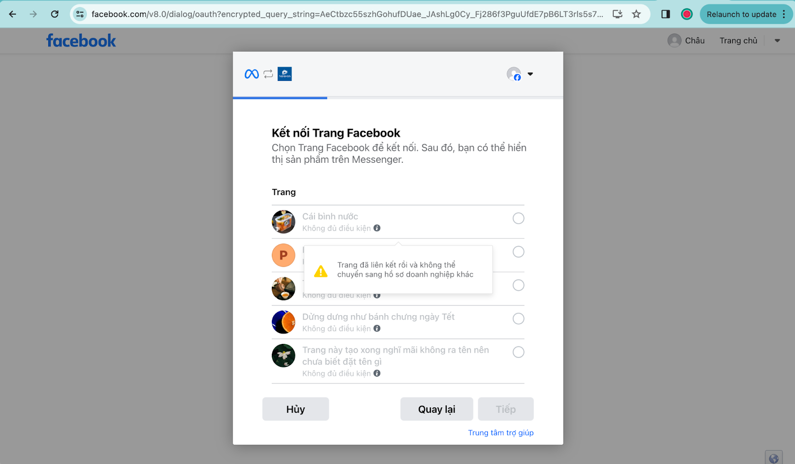 - Nguyên nhân: tại 1 thời điểm, Meta chỉ cho phép 1 trang kết nối với 1 ứng dụng sử dụng công cụ khám sản phẩm trên Messenger.