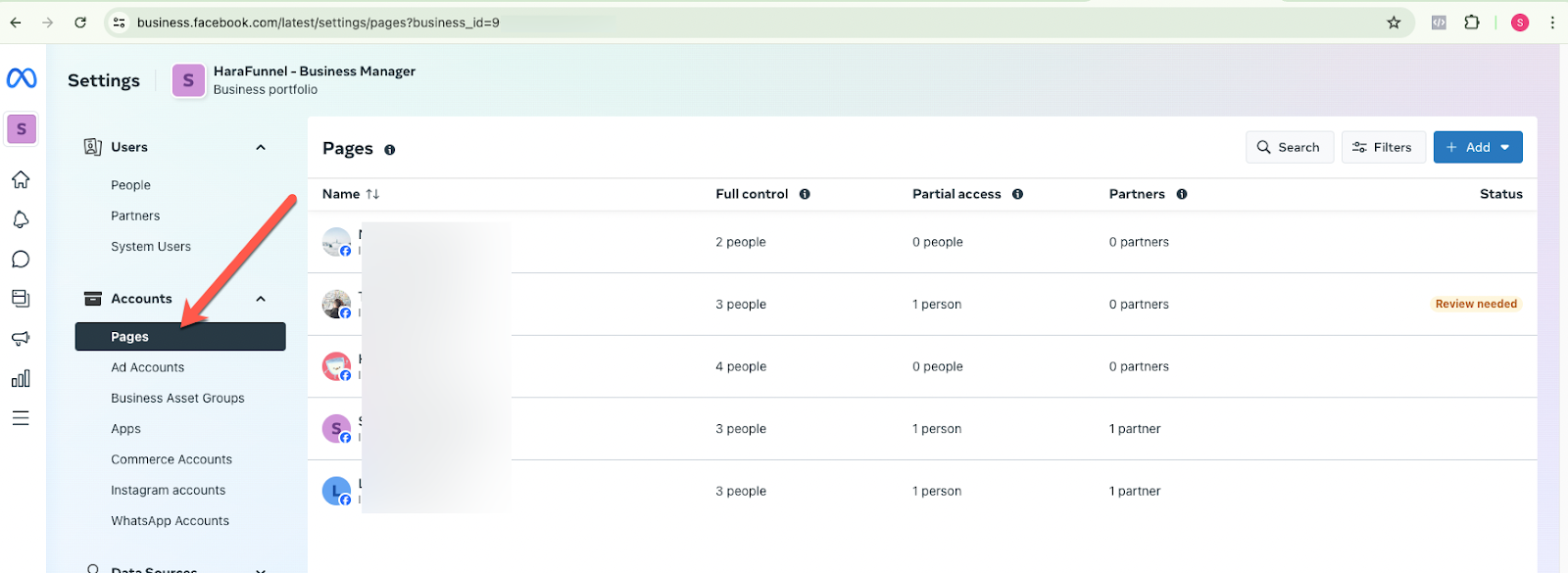 - Bước 2: Trên danh sách Menu, chọn menu "Pages" → Kiểm tra trang muốn kết nối có nằm trong danh sách trang được Business Manager quản lý hay chưa.