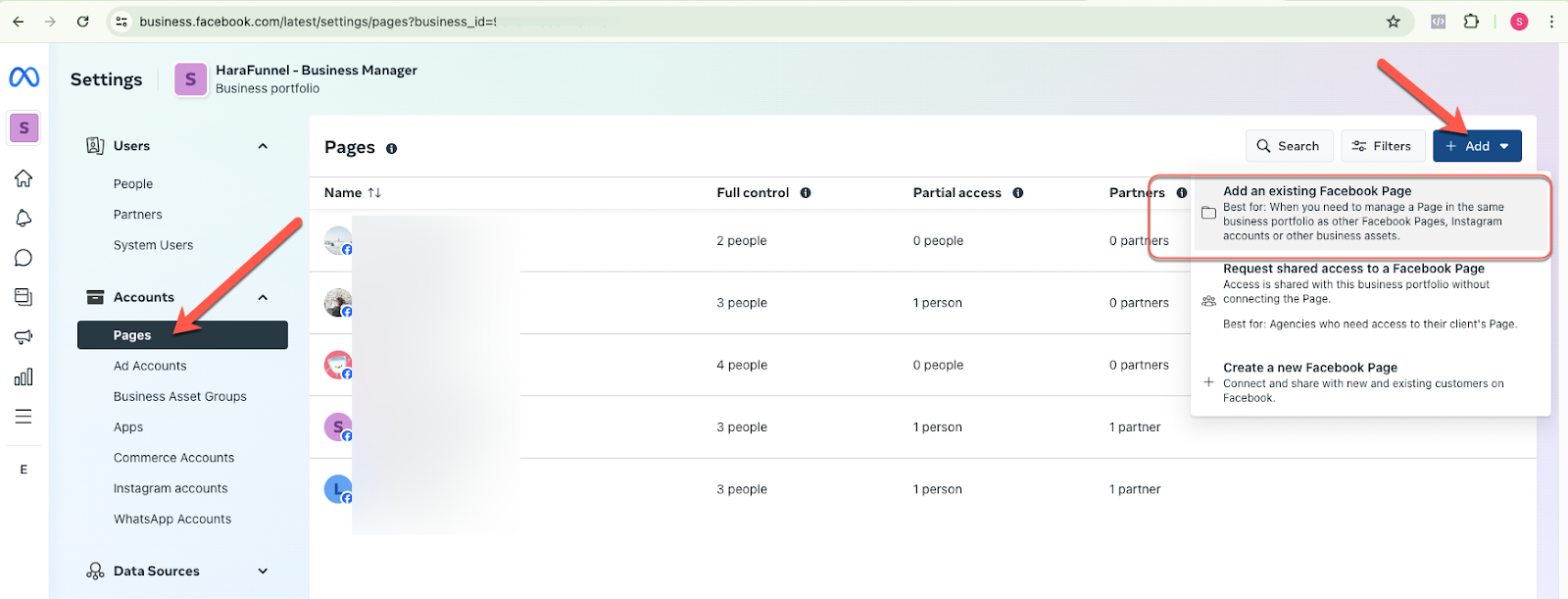 - Bước 3: Nếu trang muốn kết nối chưa được thêm vào Business Manager quản lý thì bấm vào nút "Add" ở góc phải trên để thêm trang.