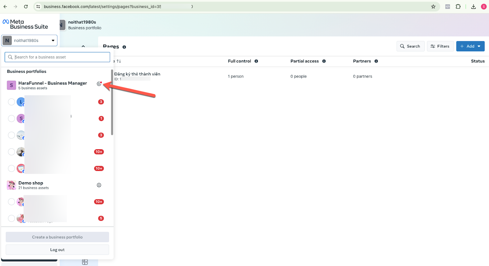 - Bước 4: Tìm Trang bạn muốn sử dụng và nhấp vào biểu tượng "⌄" ở phía bên phải **→Trong phần "Quyền kiểm soát đầy đủ**(công cụ doanh nghiệp và Facebook)" đảm bảo rằng **"Tất cả"** đã được bật.