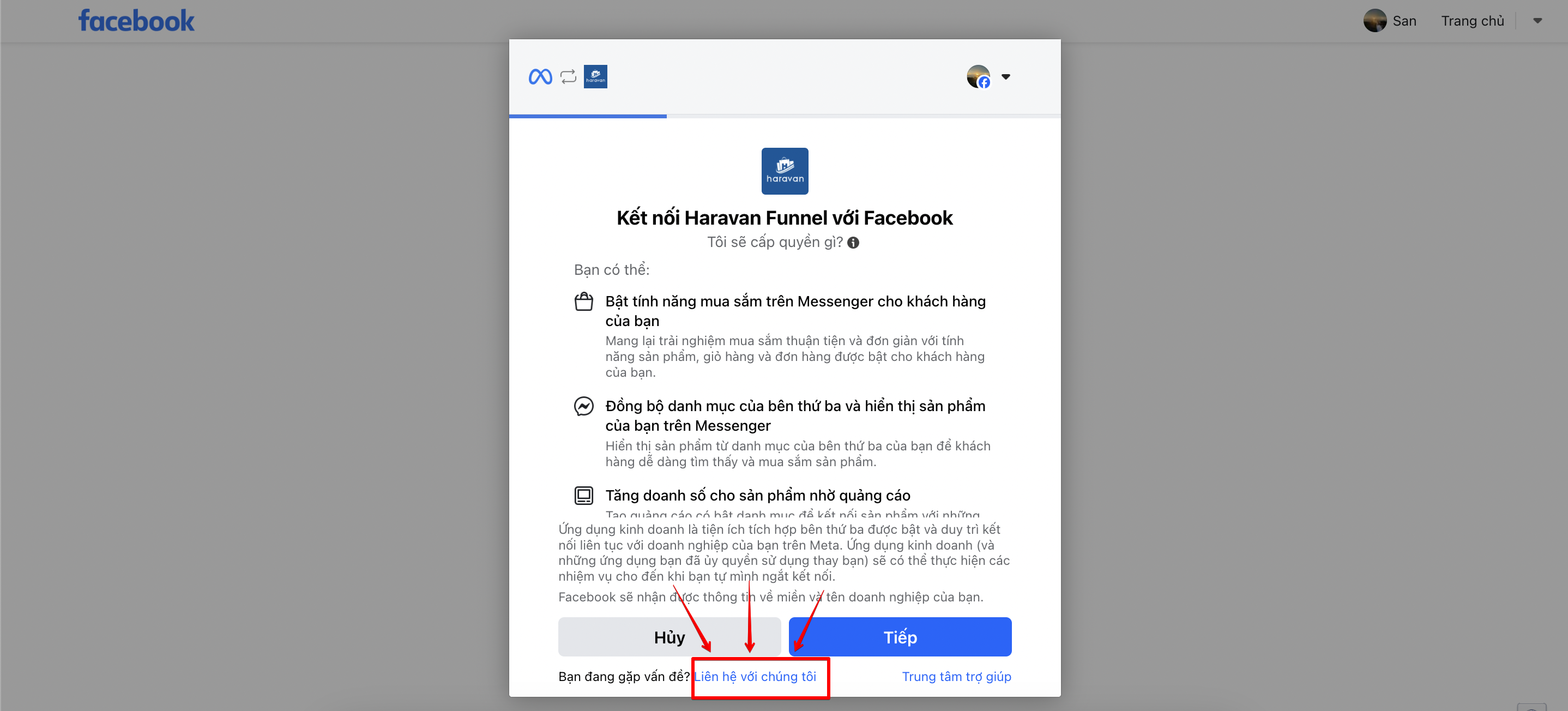 Bạn có thể nhấn vào nút**"Liên hệ với chúng tôi"** tại bước kết nối tài khoản Business Manager để đồng bộ sản phẩm lên công cụ khám phá sản phẩm trên Messenger. Hoặc bạn có thể truy cập vào link này tại đây để gửi yêu cầu hỗ trợ.