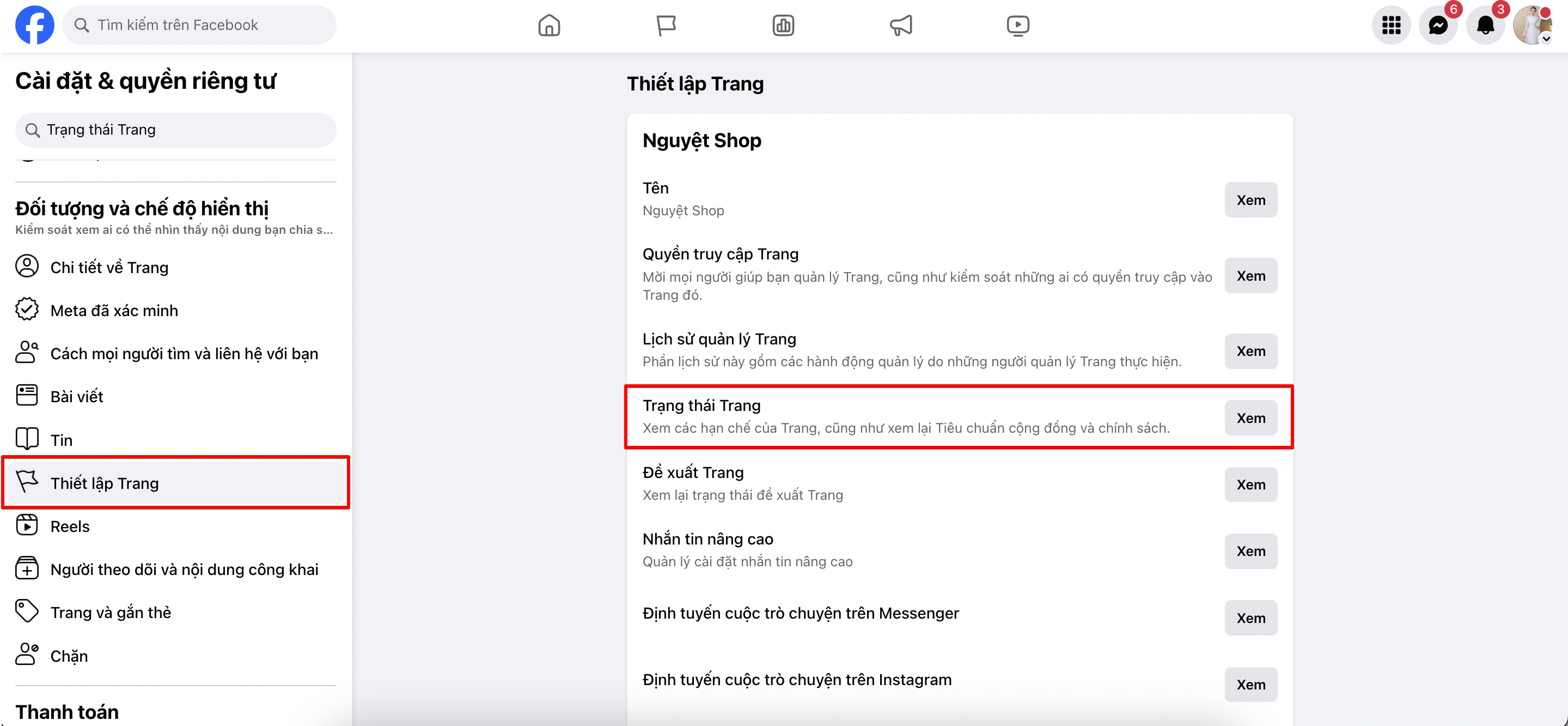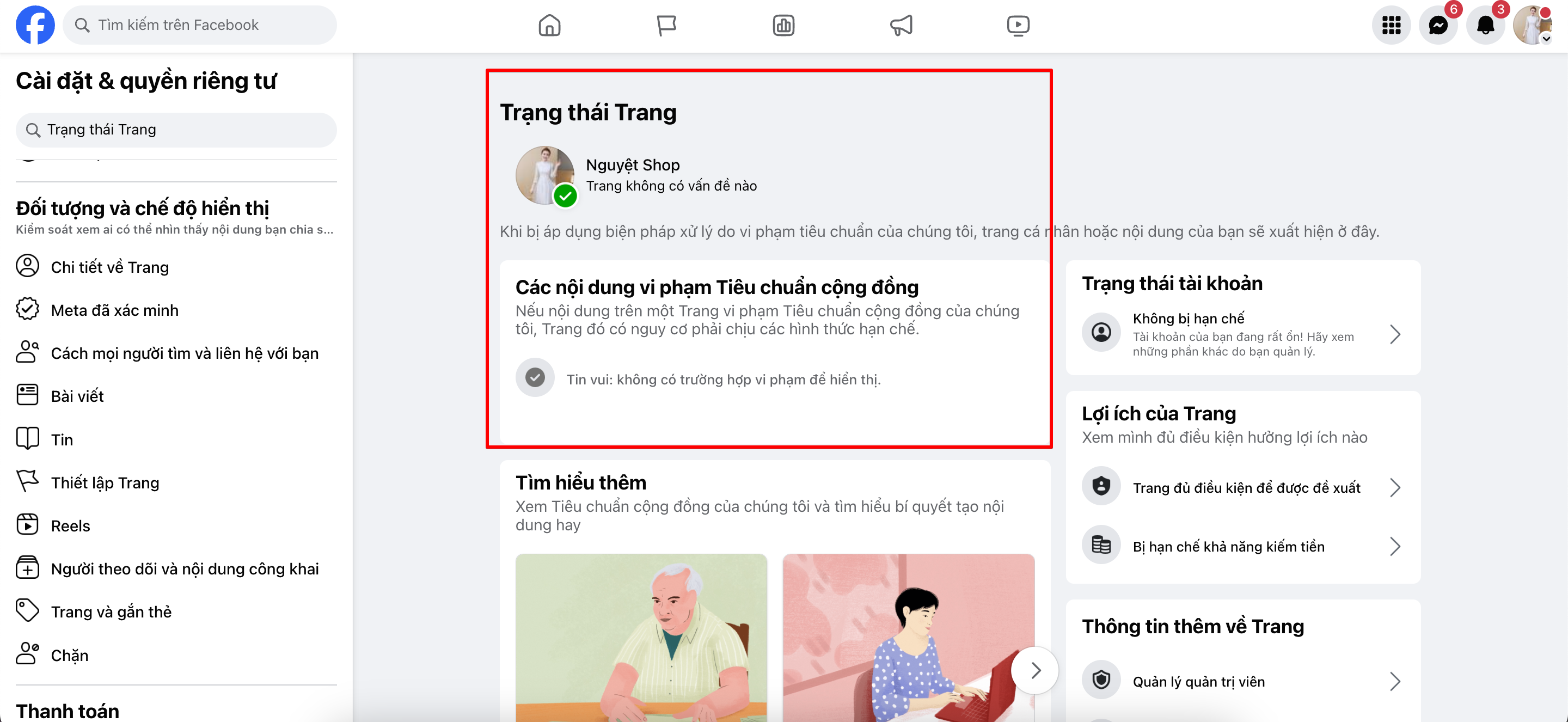 - Kiểm tra chất lượng trang fanpage của bạn Cài đặt****→ Thiết lập trang****→ Trạng thái trang:****