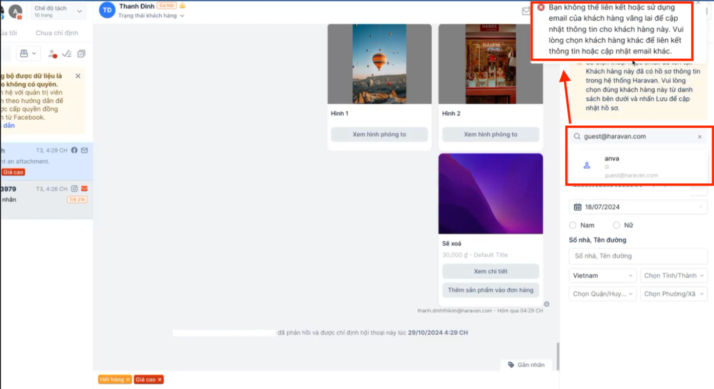 Ở luồng cập nhật profile cho một khách hàng mới, nhà bán sẽ không thể liên kết hồ sơ có email là [email protected], mà phải chọn một email khách thì mới nhấn lưu hồ sơ khách hàng được.