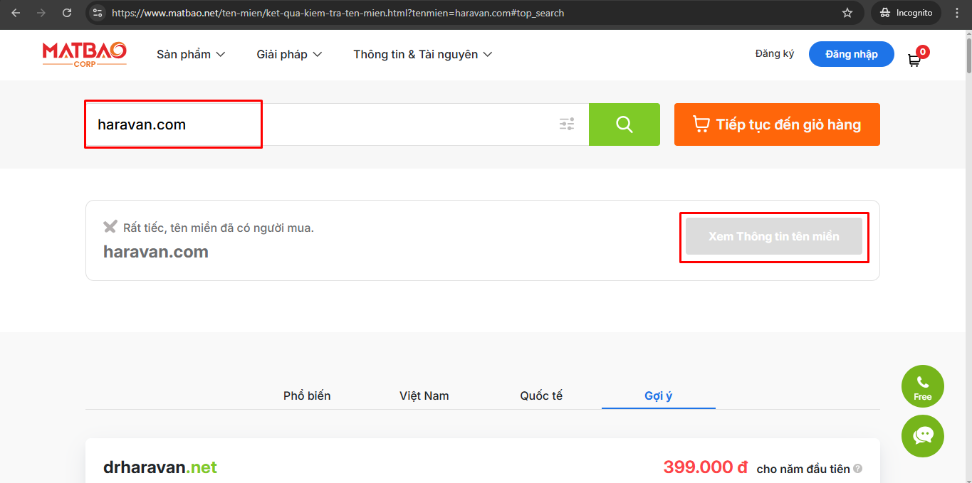 - Truy cập 1 trong các trang web cung cấp tên miền ví dụ như: https://www.matbao.net/