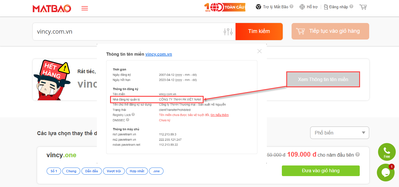 Giải pháp: Bạn truy cập website https://www.matbao.net/ hoặc https://www.pavietnam.vn và nhập tên miền của mình vào ô tìm kiếm và chọn Kiểm tra