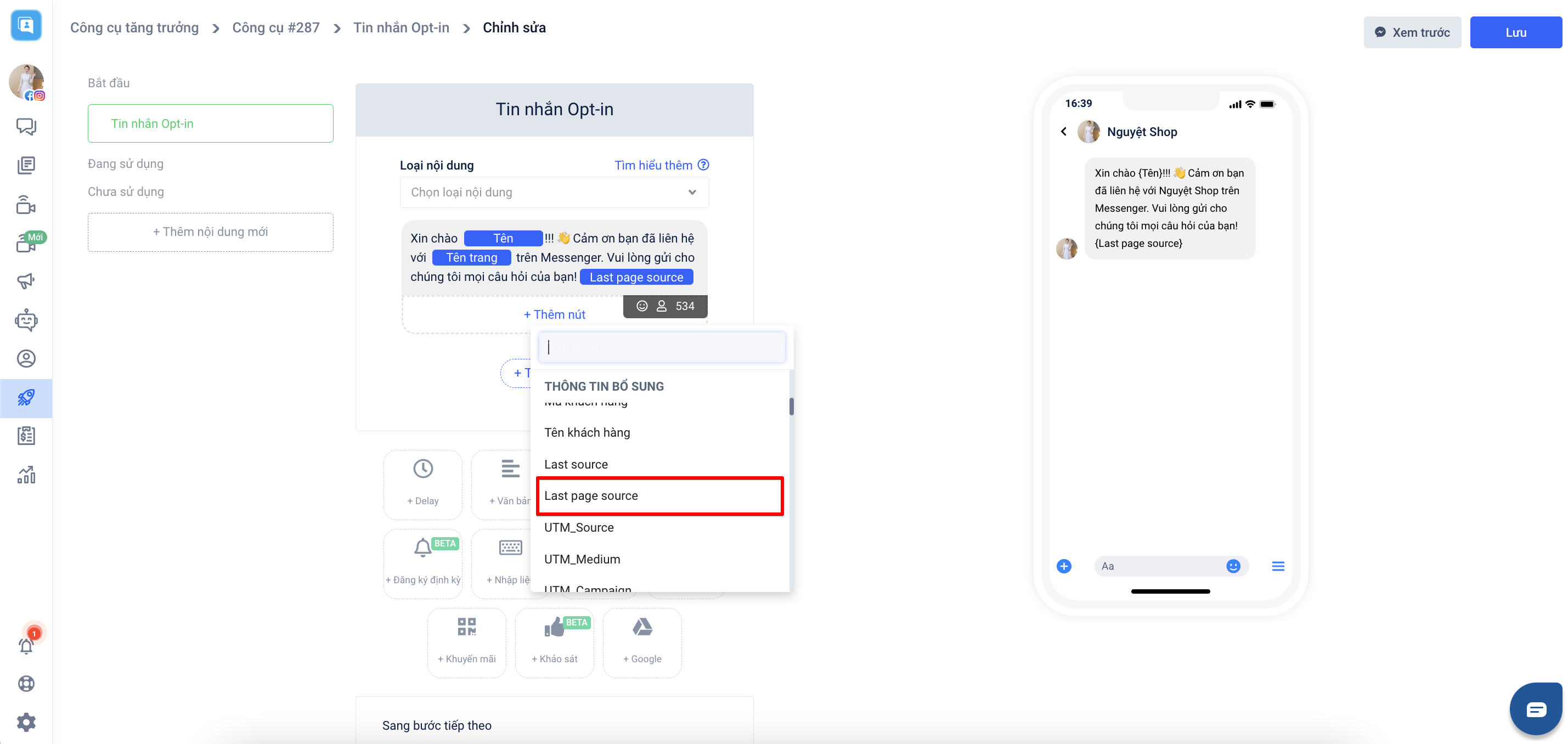 => Tuy nhiên, hiện tại hệ thống sẽ chỉ hỗ trợ áp dụng hỗ trợ gắn trường custom field last_page_source cho kịch bản customer chat và chưa hỗ trợ cho kịch bản đường dẫn ref hoặc các tool chatbot khác.