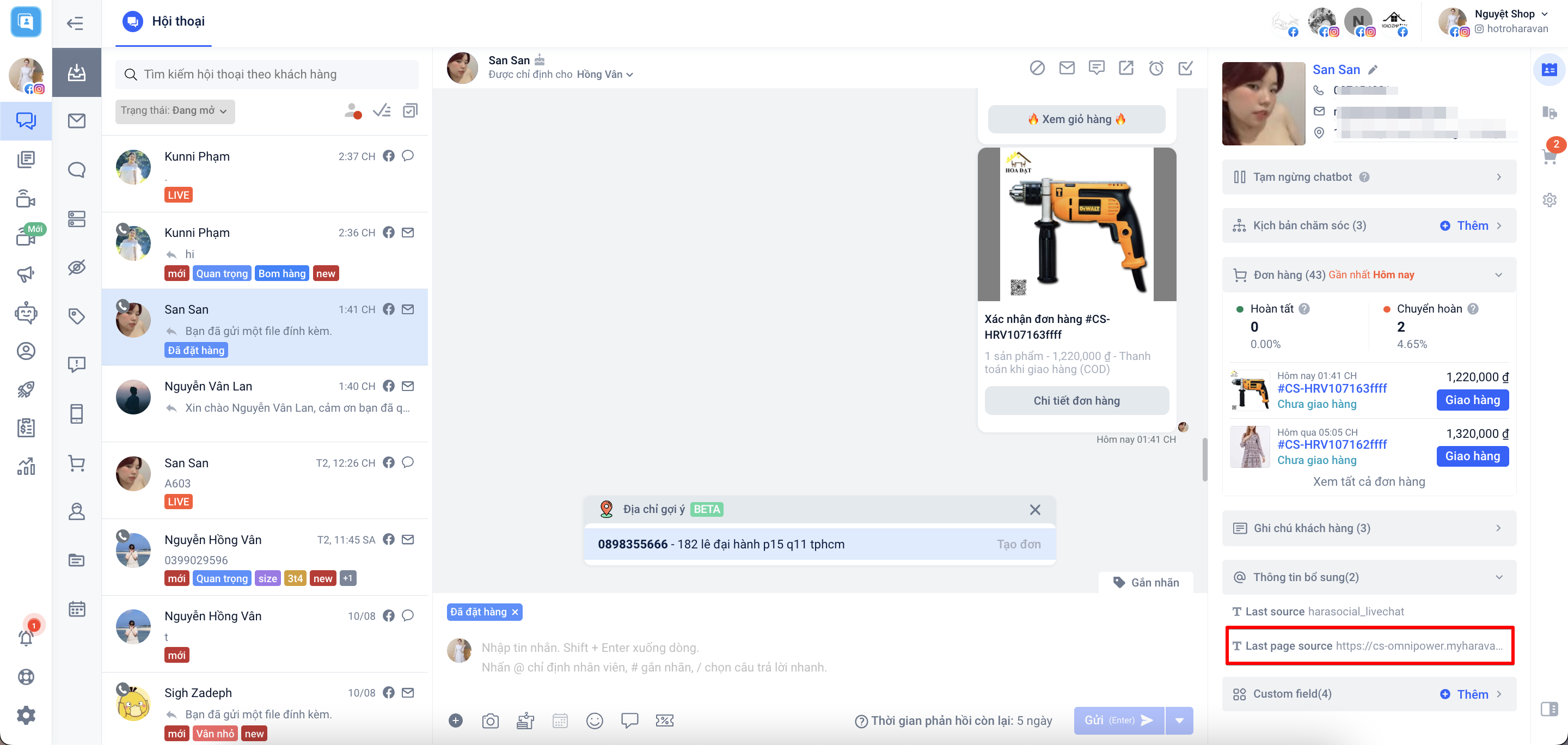 Khi khách hàng nhắn tin vào nút chat tại website, khi đồng bộ về hội thoại Harasocial sẽ hiển thị last_page_source tại mục thông tin bổ sung như sau: