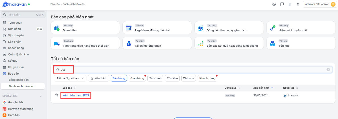 - Trong danh sách báo cáo, bạn nhập Kênh bán hàng POSvào ô tìm kiếm và chọn báo cáo này.