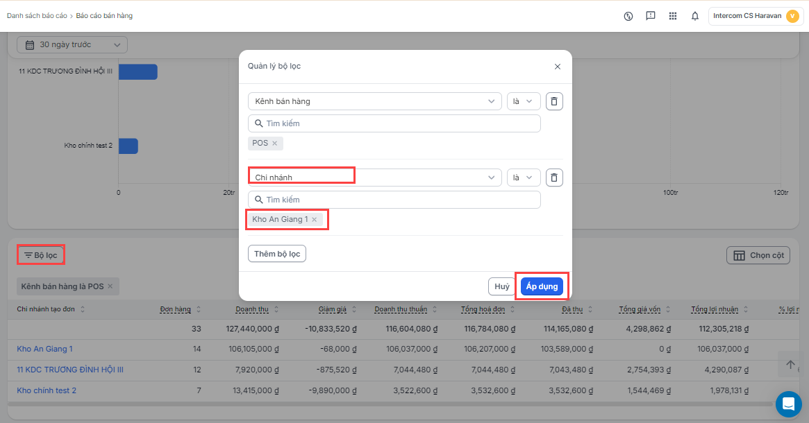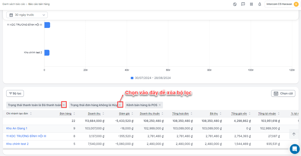 4. Sau khi xóa 2 bộ lọc trạng thái thanh toán và trạng thái đơn, bạnthêm bộ lọc Chi nhánh để lọc chi nhánh muốn xem báo cáo.