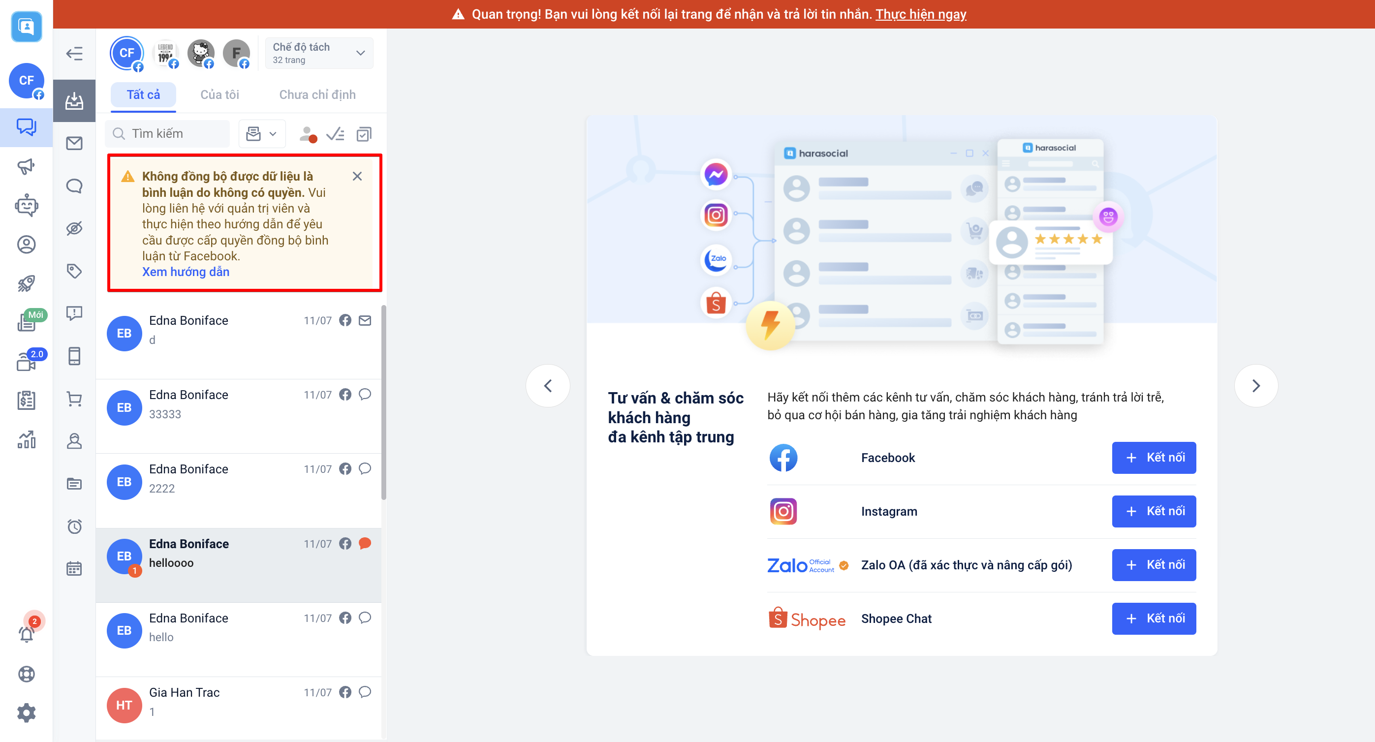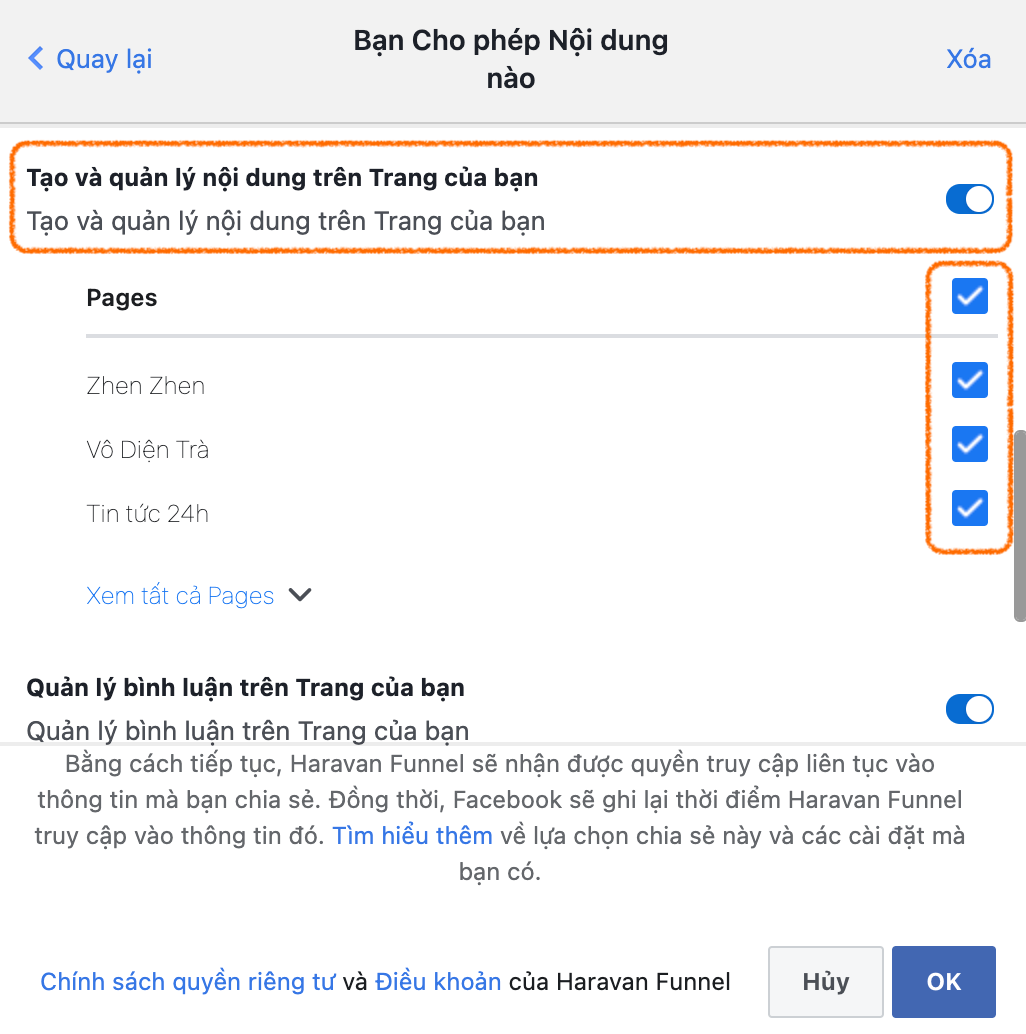 Nguyên nhân: khi thực hiện kết nối trang, bạn không kích hoạt cho phép các quyền về quản lý bình luận nên khi đó hệ thống sẽ không thể đồng bộ được dữ liệu bài viết và thực hiện các thao tác như thích, xóa, ẩn, nhắn tin trên bình luận.