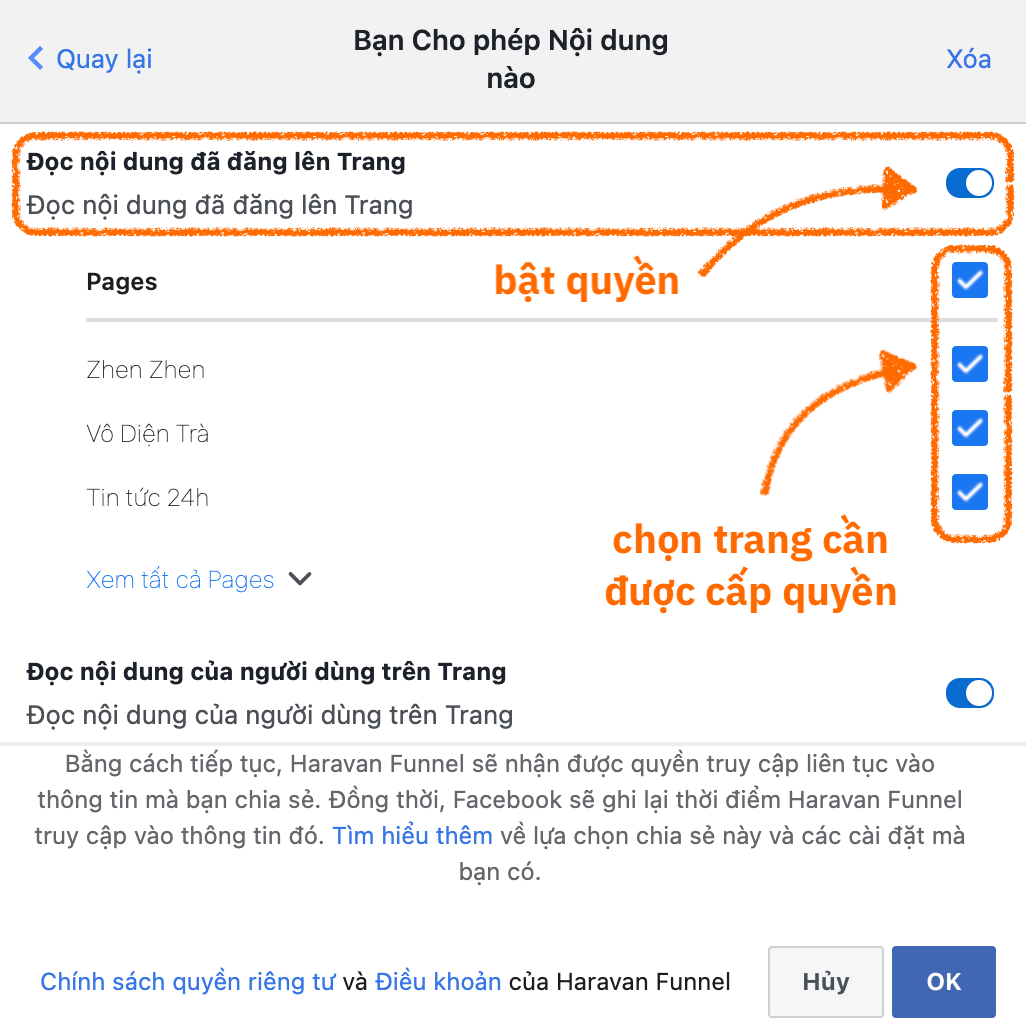 Lưu ý: nhấn tích chọn những trang muốn được cấp quyền