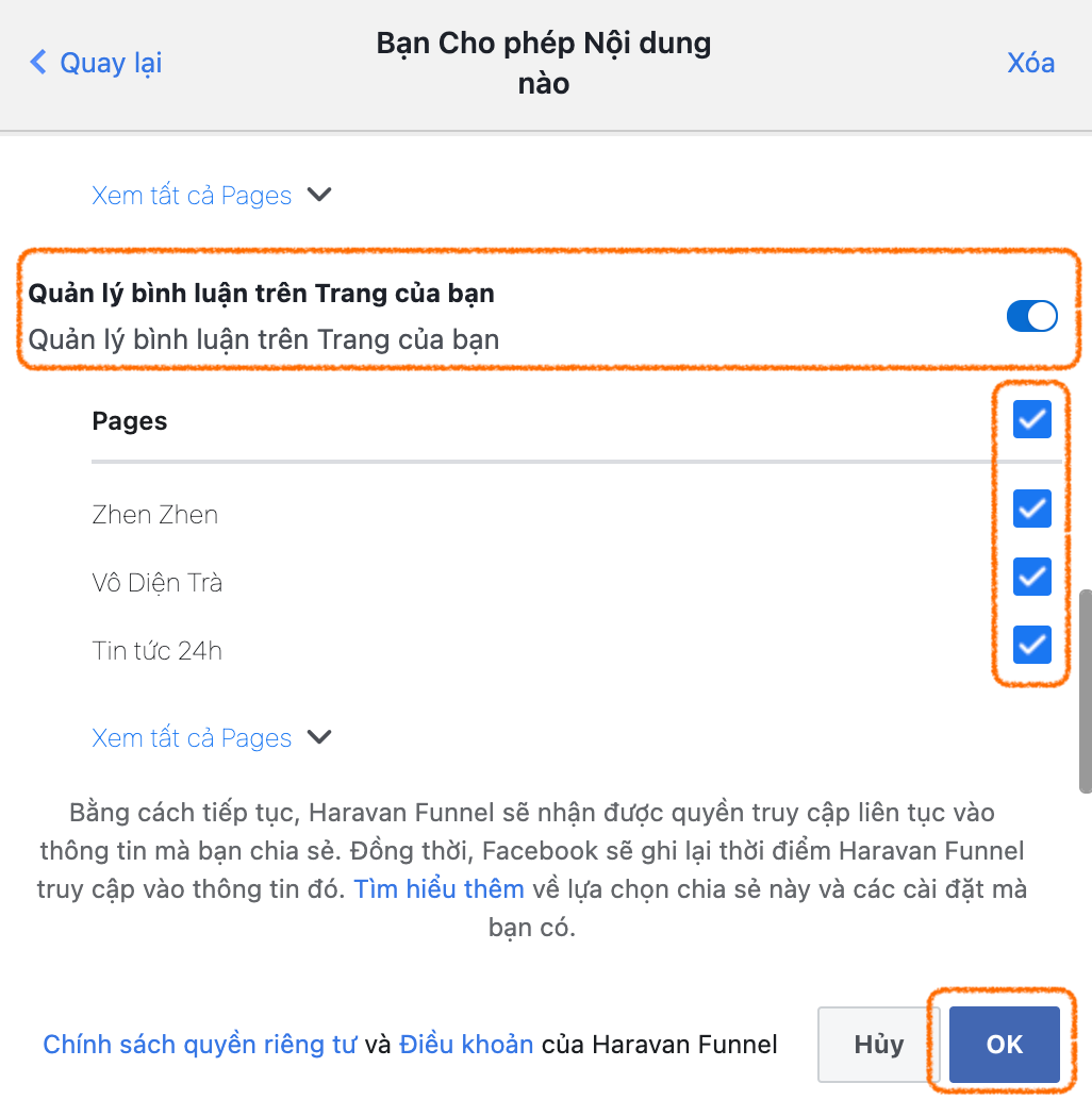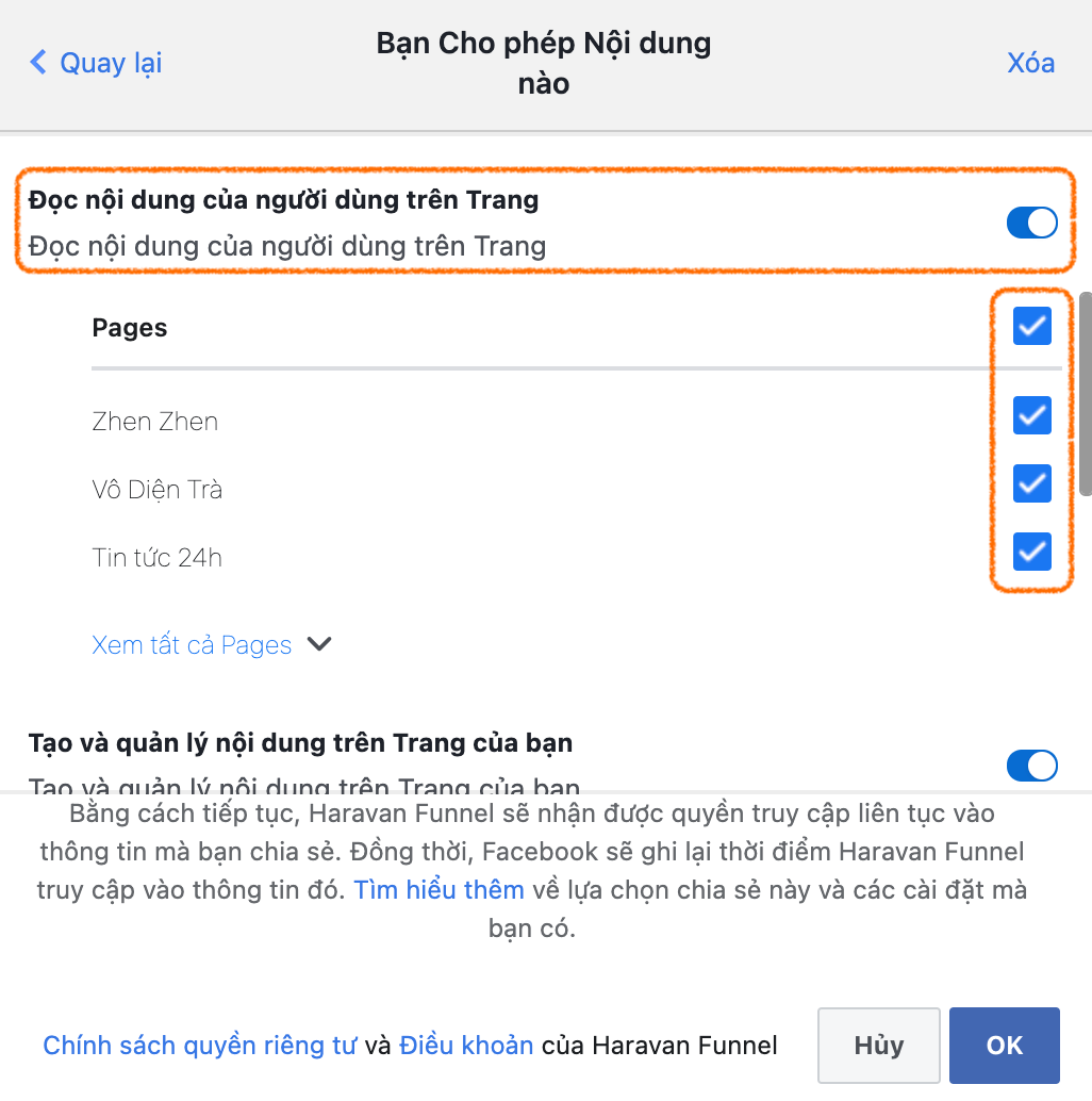 Cách khắc phục: Thực hiện kết nối lại trang và cho tích chọn đầy đủ cho phép các quyền cần thiết.
