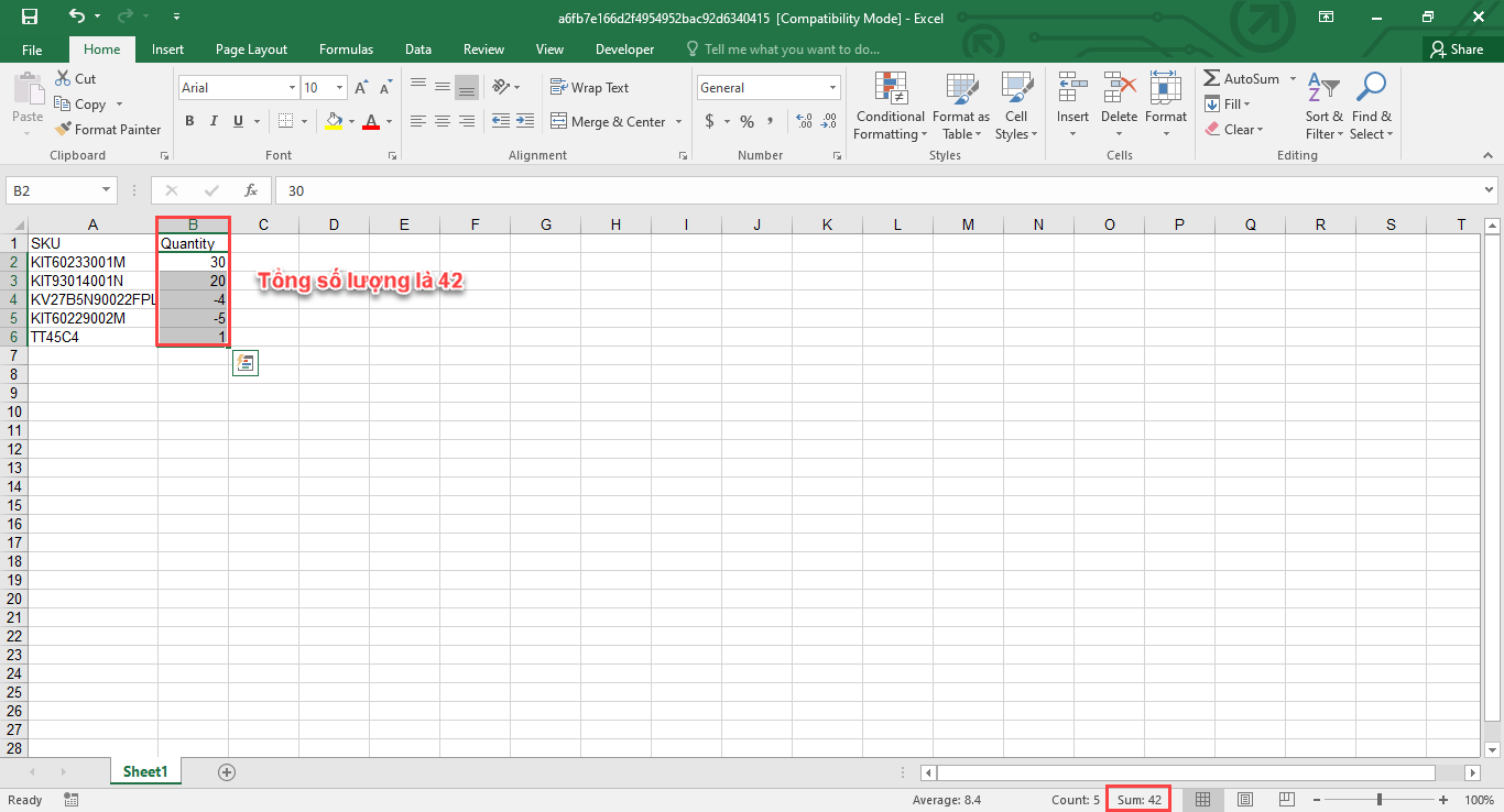 Vấn đề: Nhà bán hàng nhập file dữ liệu để thực hiện điều chỉnh tồn nhanh, tổng số sản phẩm trong file nhập liệu nhỏ hơn tổng số lượng trong phiếu điều chỉnh. Ví dụ tổng số lượng trên file là 42