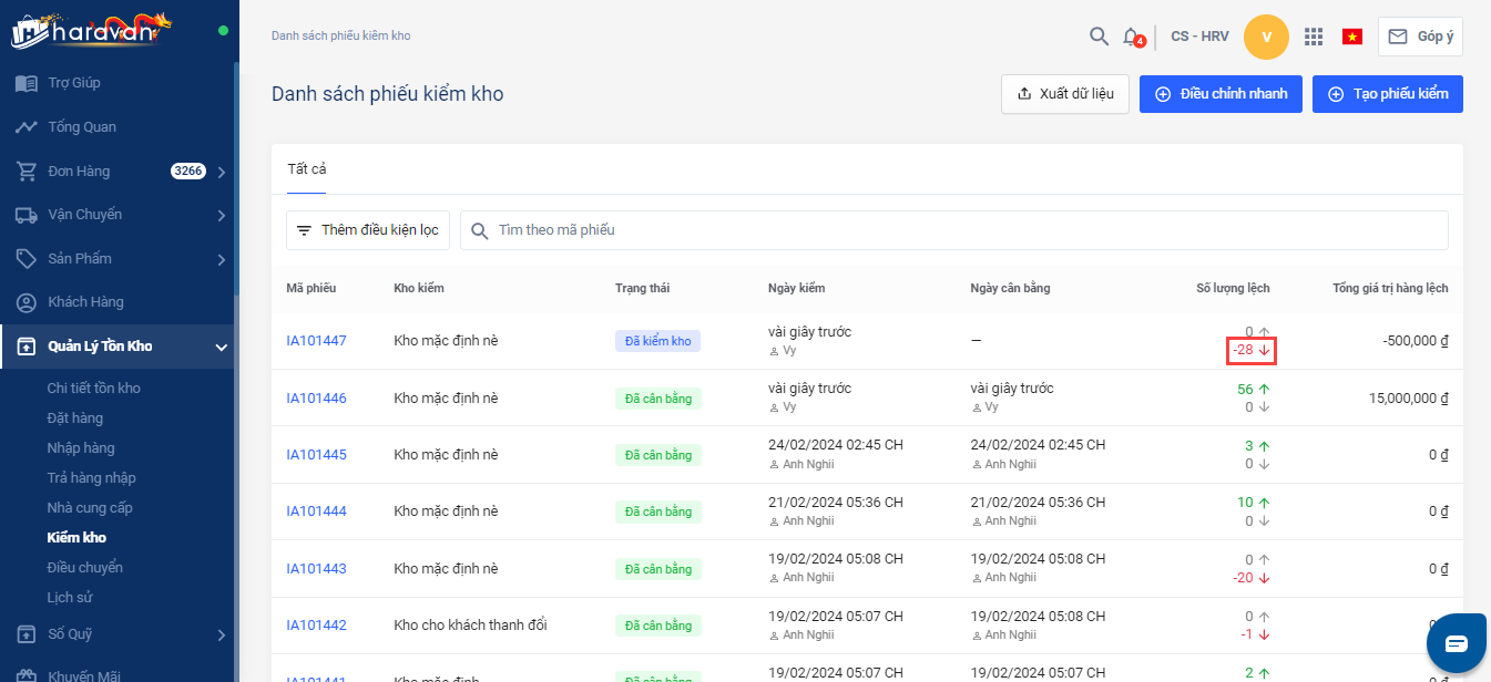 Nguyên nhân: Số lượng lệch là số chênh lệch giữa số lượng sản phẩm trước và sau khi thực hiện Điều chỉnh nhanh. Còn s**ố tồn trong phiếu** được **cộng thêm với số tồn thực tế** trên admin nên sẽ gây ra sự khác nhau giữa 2 con số này