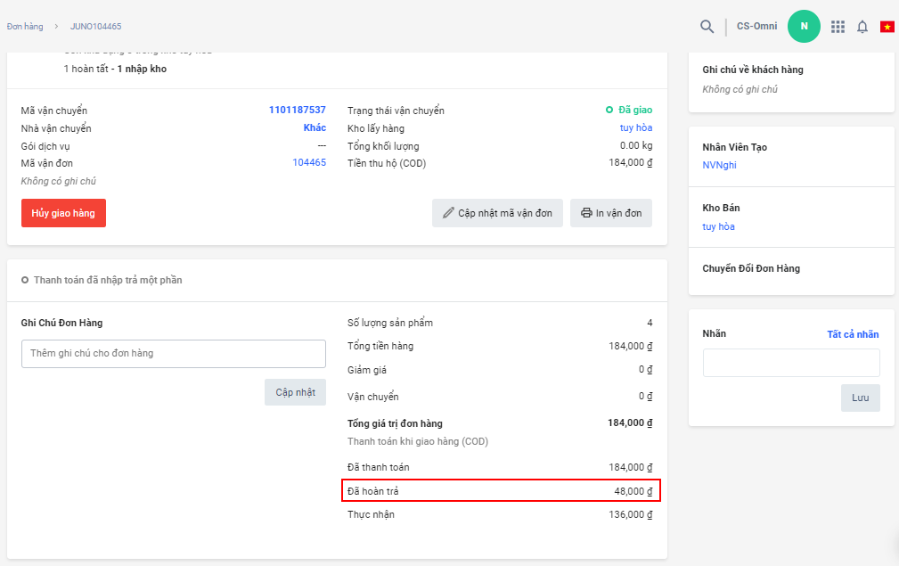 Vấn đề: Đơn hàng được hoàn trả (một phần hoặc toàn phần) nhưng lại không thấy hệ thống tạo phiếu chi ghi nhận lại số tiền hoàn trả cho khách hàng.