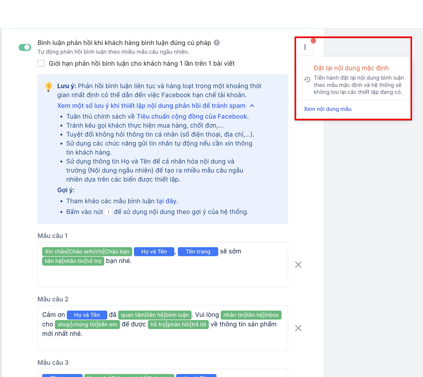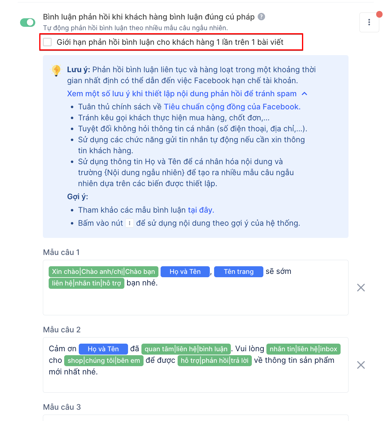 Hệ thống sẽ tự động gửi bình luận phản hồi cho khách hàng theo nhiều mẫu câu ngẫu nhiên. Tại đây hệ thống sẽ hiển thị mặc định6 mẫu câu để gửi, bạn có thể thêm đượctối đa 10 mẫu câuvà hệ thống sẽ tự động phản hồi ngẫu nhiên xen kẻ trong 10 mẫu câu đó. Tuy nhiên bạn bắtbuộc phải có 3 mẫu câu khi sử dụng công cụ phản hồi bình luận đúng cú pháp.