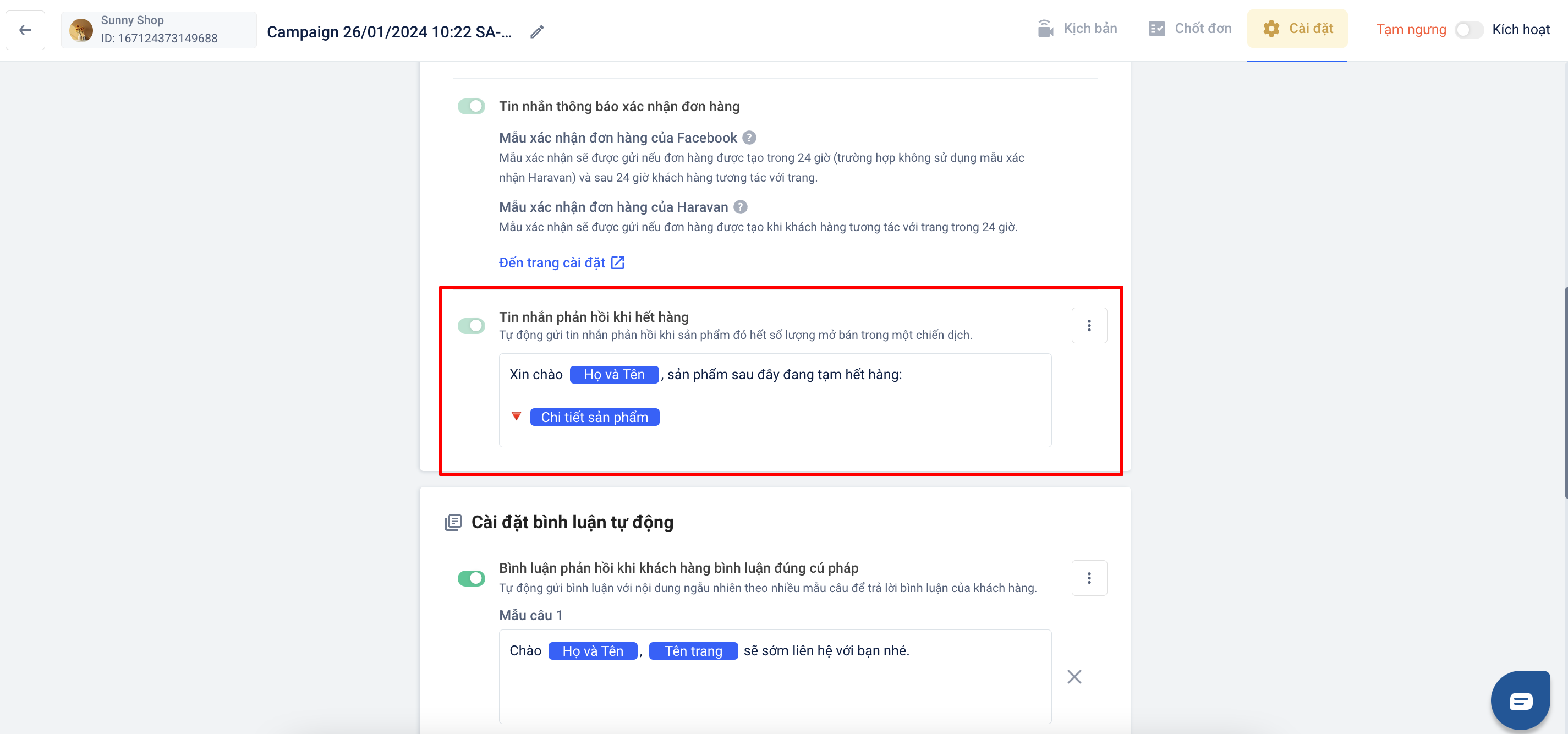 Trong trường hợp bạn có nhập số lượng mở bán, khi hết số lượng tồn kho hệ thống sẽ tự động gửi tin nhắn phản hồi khi hết hàng.