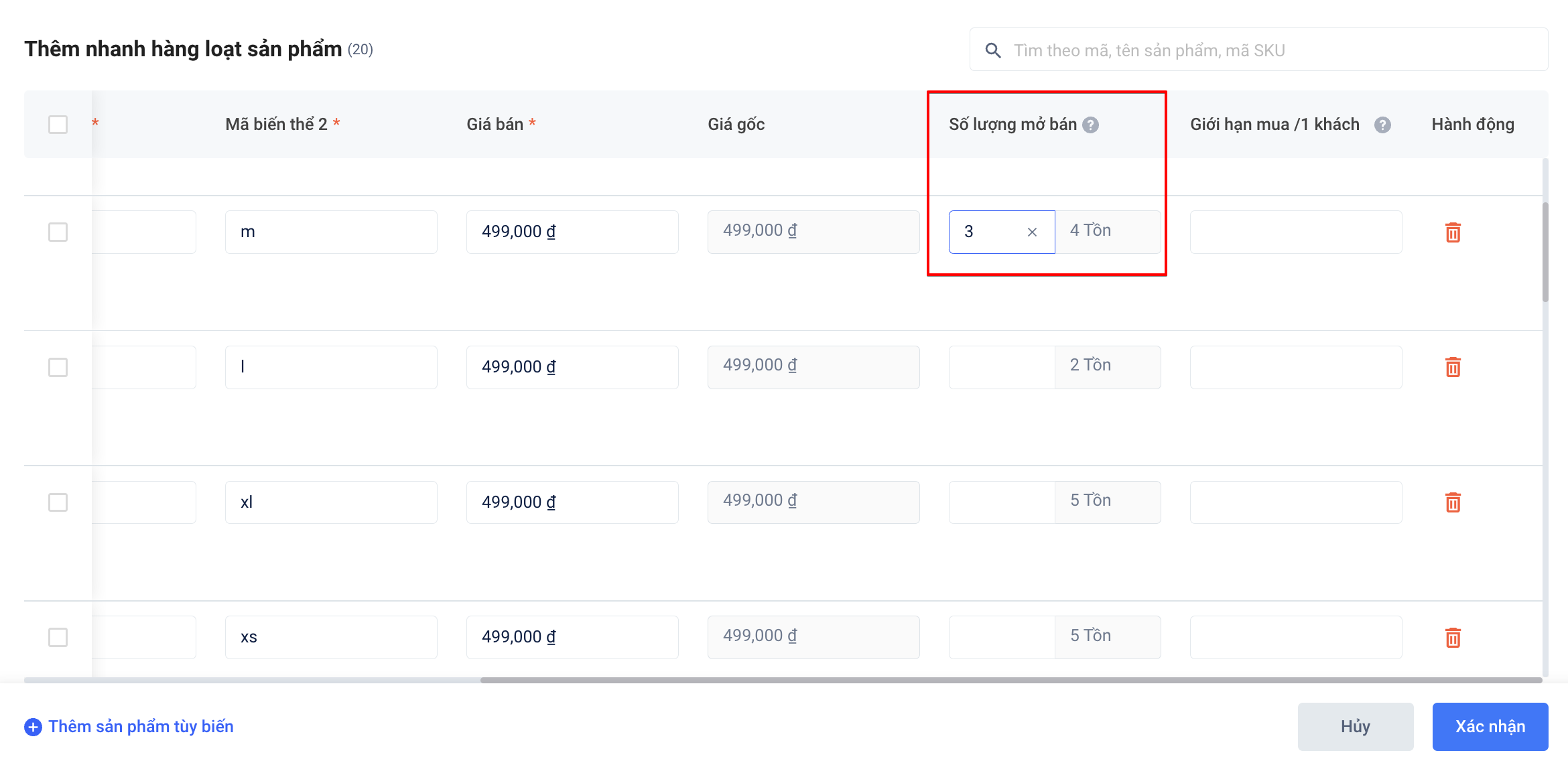 - Cách 2: Trong trường hợp bạn không kiểm tra số lượng tồn kho, bạn có thể cài đặtSố lượng mở báncho từng sản phẩm trong từng phiên live / chiến dịch, đối với cột này bạn sẽ không cần quan tâm đến số lượng tồn kho có được cập nhật đúng hay không, bạn chỉ cần quan tâm đến số lượng tối đa mà bạn sẽ bán.