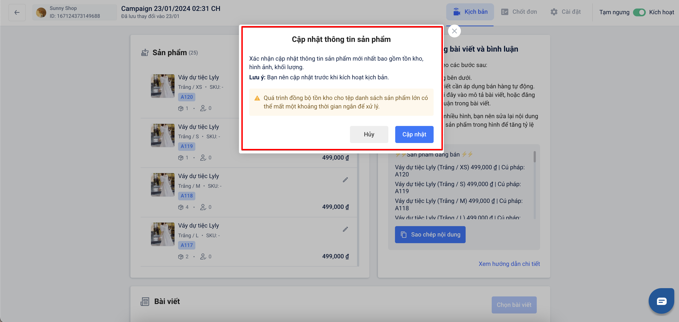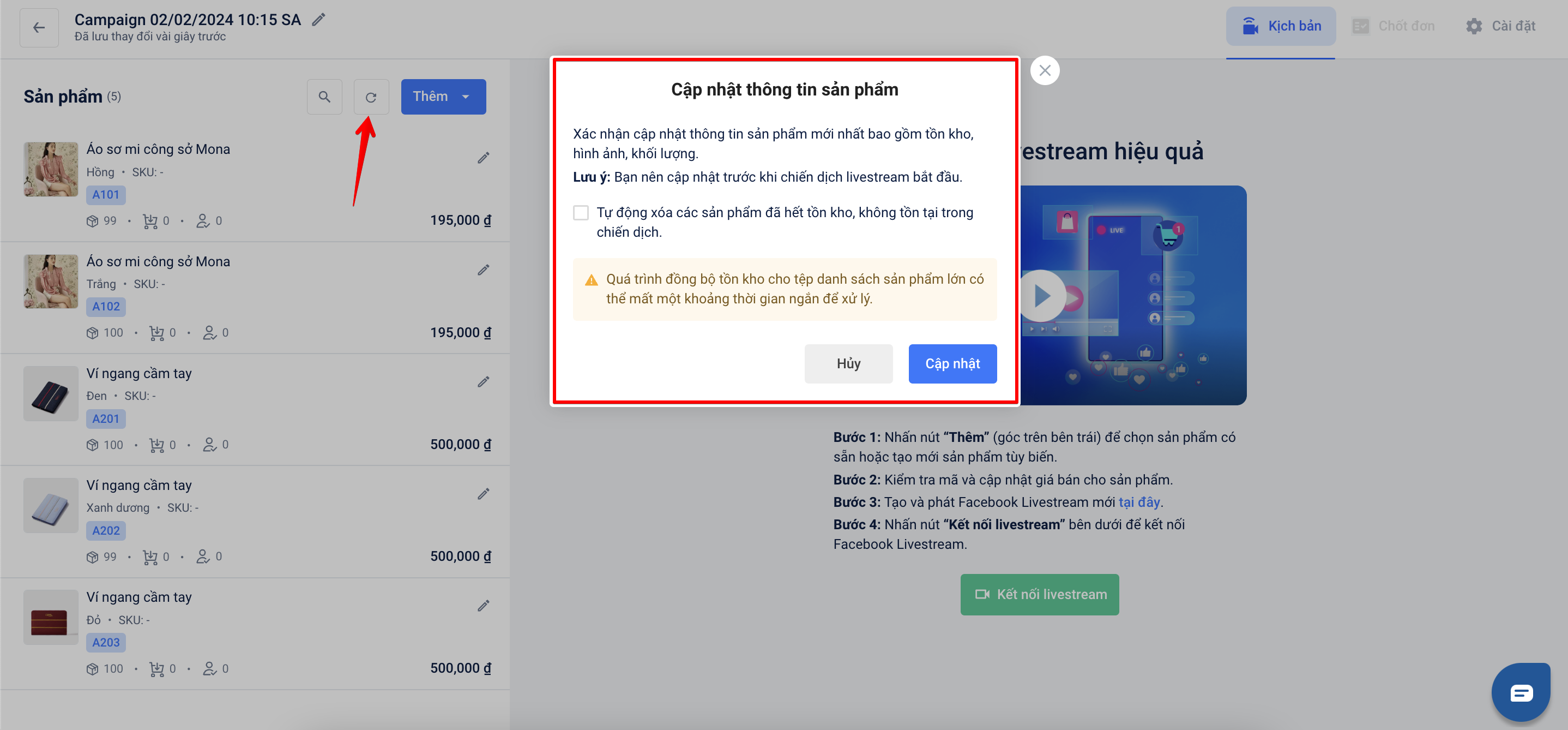 *- Cách 1:*Trong quá trình Livestream hoặc chiến dịch Tin bán hàng đang kích hoạt bạn có thể nhấn vào nút "Cập nhật thông tin sản phẩm" ở đầu danh sách sản phẩm để xem được thông tin sản phẩm mới nhất được đồng bộ từ Omni.