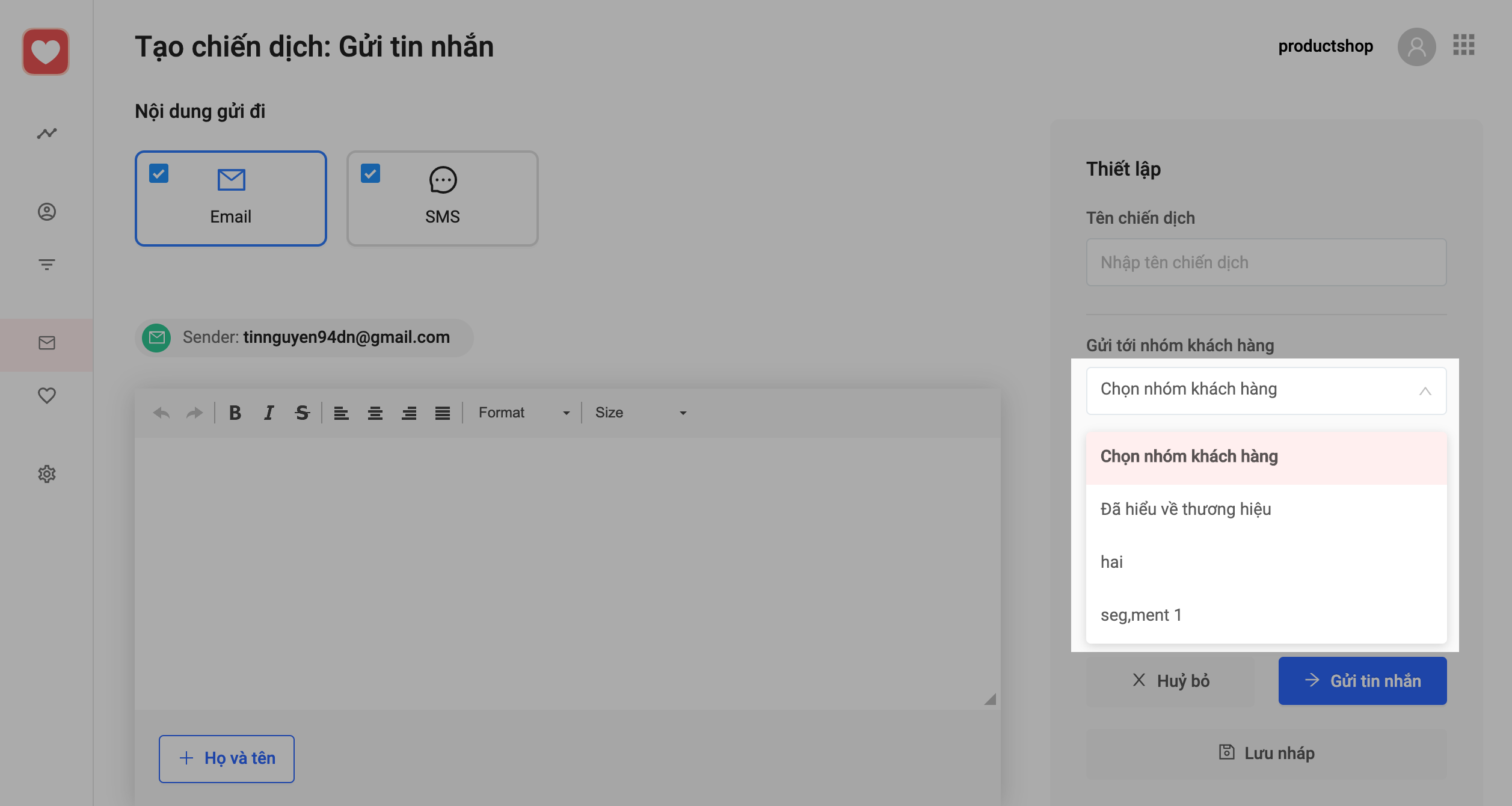 Để xem thử nội dung chiến dịch trước khi gửi đến khác hàng, đầu tiên bạn cần tạo một nhóm đối tượng bao gồm bạn và các thành viên của doanh nghiệp để nhận Email và SMS nháp. Email chiến dịch hiện tại chưa thể đính kèm hình ảnh.