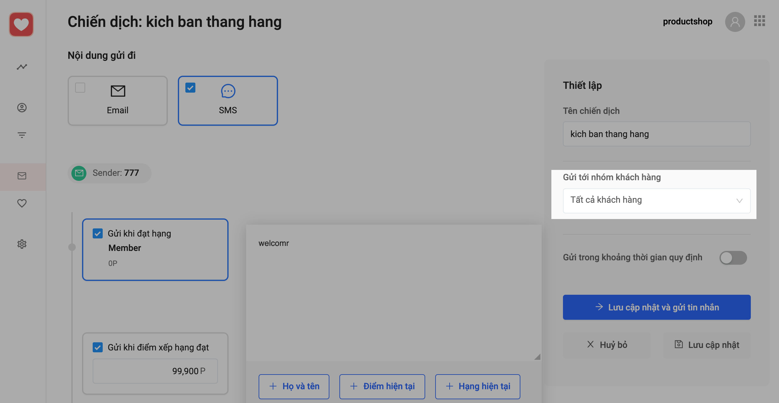 Và chọn lại nhóm đối tượng sau đó nhấn Lưu cập nhật và gửi tin nhắn để hoàn tất.