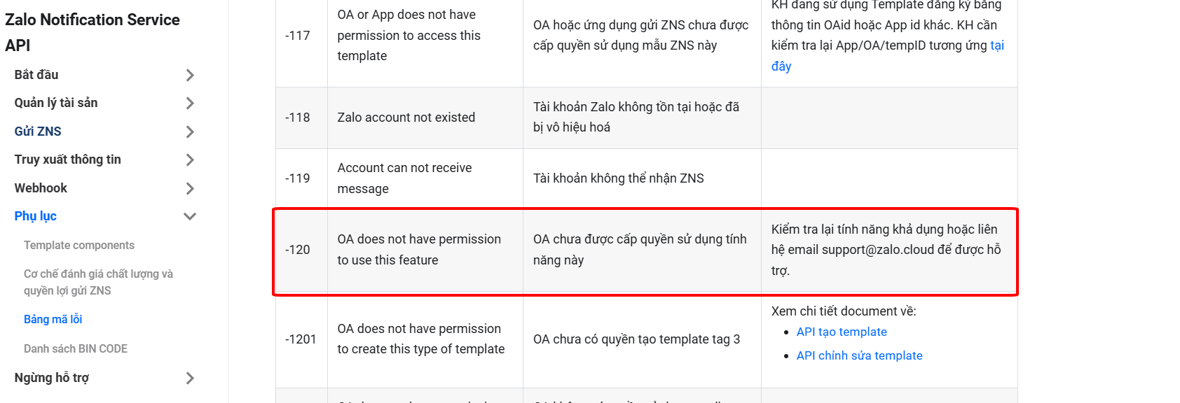 Khi găp các lỗi trong quá trình sử dụng Zalo ZNS, bạn tham khảo Bảng mã lỗi do Zalo cung cấp: https://developers.zalo.me/docs/zalo-notification-service/phu-luc/bang-ma-loi