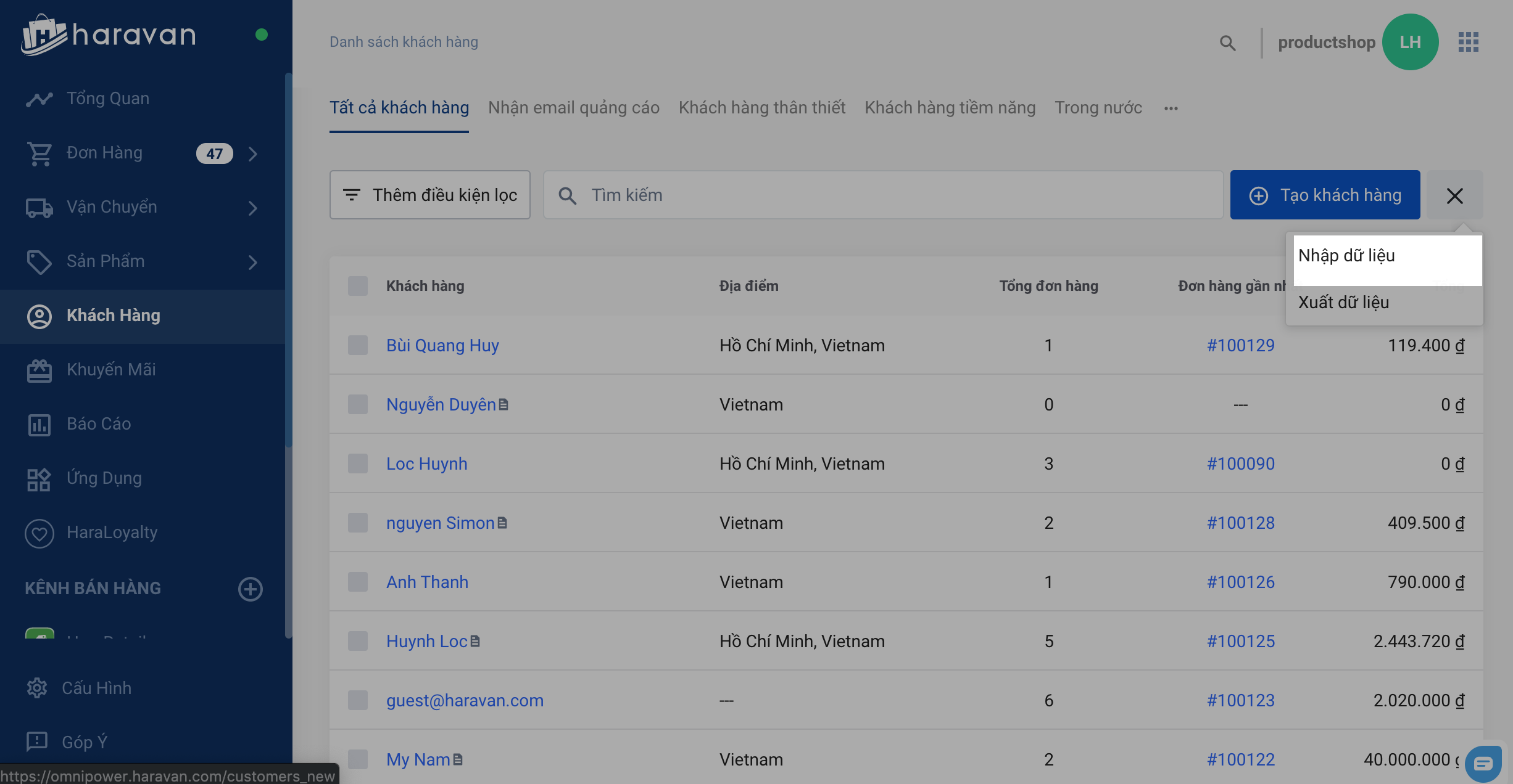 Trong trường hợp các nguồn khách không đến từ các kênh liên kết với Haravan, bạn có thể nhập thông tin khách hàng vào hệ thống trang quản trị MyHaravan và thông tin khách hàng sẽ được đồng bộ về Haraloyalty.