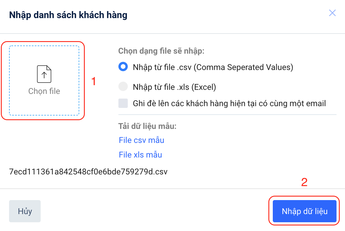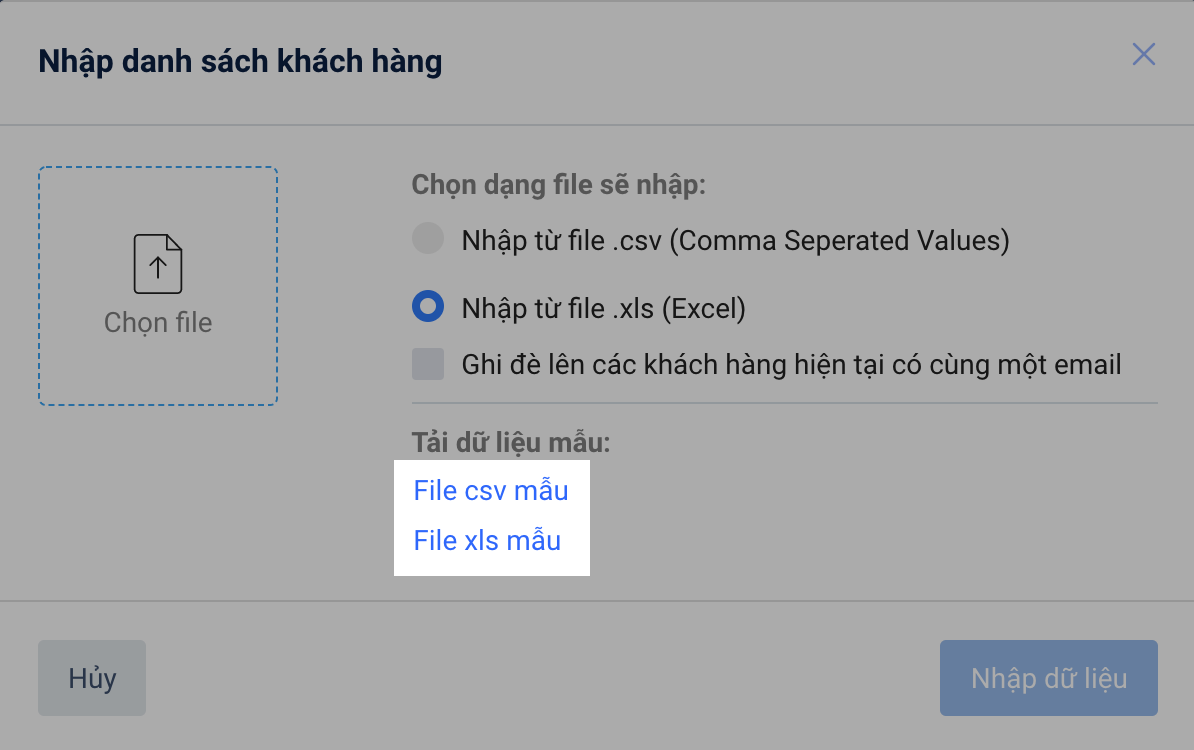 Sau khi hoàn tất nhập thông tin khách hàng, bạn có thể bắt đầu tải file lên hệ thống. Lưu ý: Bạn hãy chọn đúng định dạng file để đăng tải.