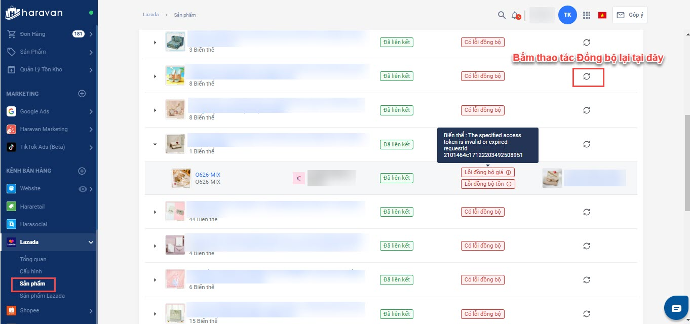 **3.**Lỗi The specified access token is invalid or expired: Lỗi đồng bộ giá và sản phẩm do liên kết giữa sàn và Haravan hết hạn