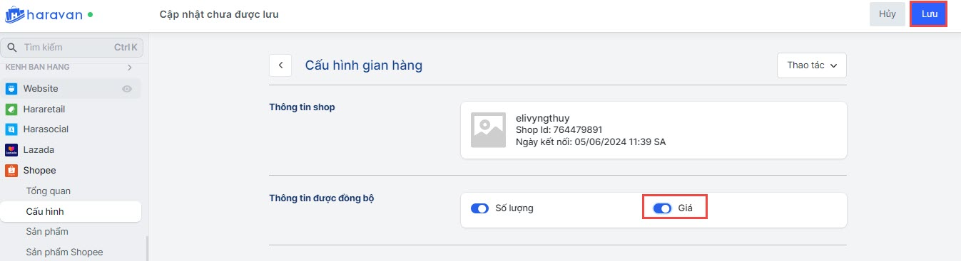 **Giải pháp: Bạn vào cấu hình gian hàng, bật đồng bộ giá và chọn Lưu.**