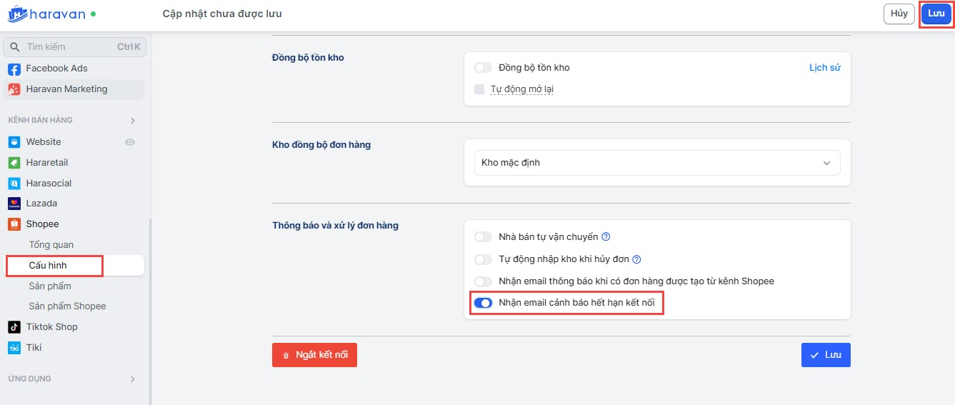 Bên cạnh đó, Haravan bổ sung tính năng gửi email thông báo nếu kết nối sắp hết hạn trong vòng 7 ngày, để nhà bán hàng có thể vào làm mới kịp thời. Để bật tính năng thông báo, nhà bán hàng vào cấu hình của từng kênh và bật Nhận email cảnh báo hết hạn kết nối.