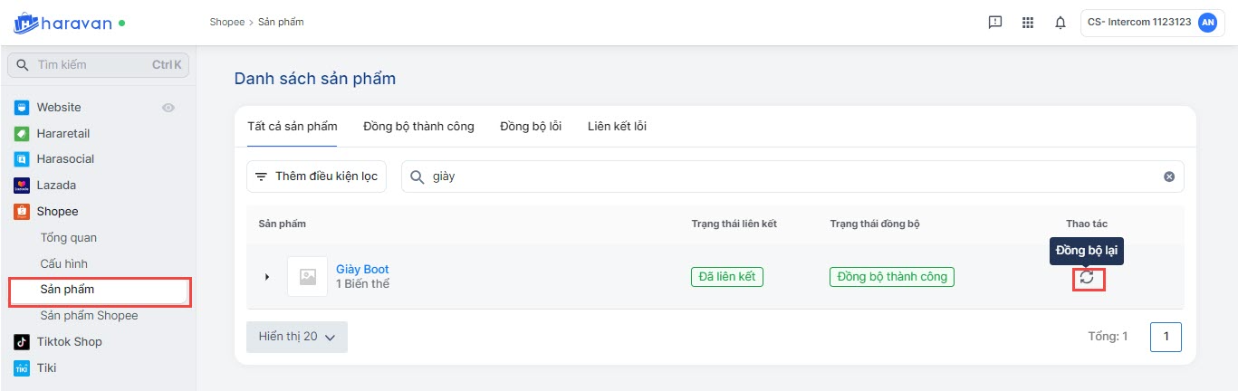 Sau đó, bạn vào menu Sản phẩm, tìm sản phẩm và bấm thao tác Đồng bộ lại (thao tác sẽ mất vài phút để hoàn tất.