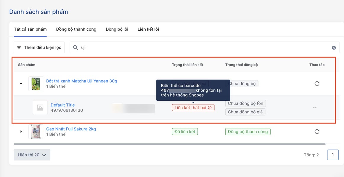 **Giải pháp: Nhà bán hàng thực hiện làm mới lại liên kếtvà thao tác đồng bộ lại sản phẩm.**