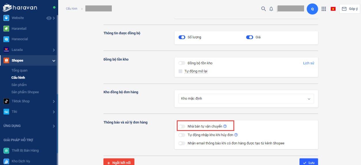 Chỉ bật cấu hình khi Nhà bán hàng được kích hoạt tính năng Nhà bán tự vận chuyển bên kênh quản lý sàn thương mại điện tử.