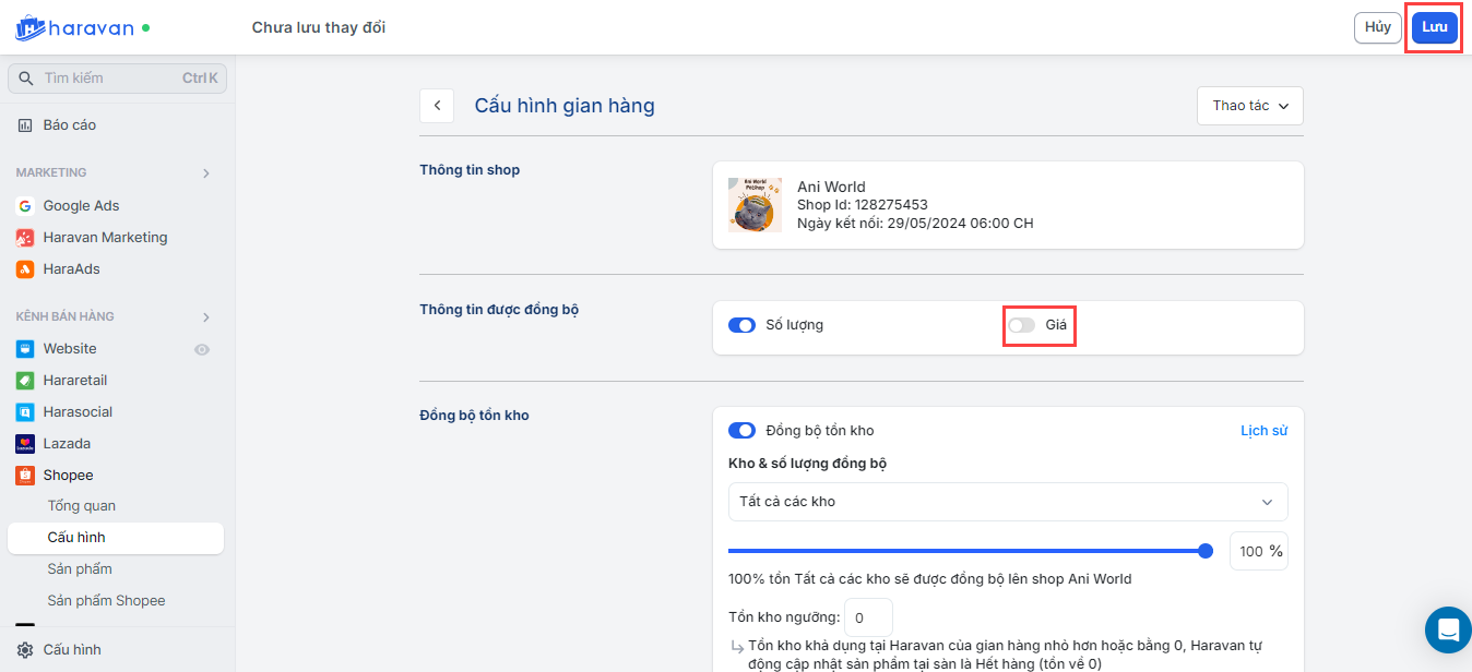 2. Tắt đồng bộ Giá và **chọn Lưu.**Việc ngừng đồng bộ giá giữa hai hệ thống sẽ áp dụng sau thời điểm nhà bán ngừng đồng bộ giá. Những cập nhật về giá trước khi tắt đồng bộ sẽ không được cập nhật lại, do đó, nhà bán cần tự điều chỉnh lại giá ở hai hệ thống.