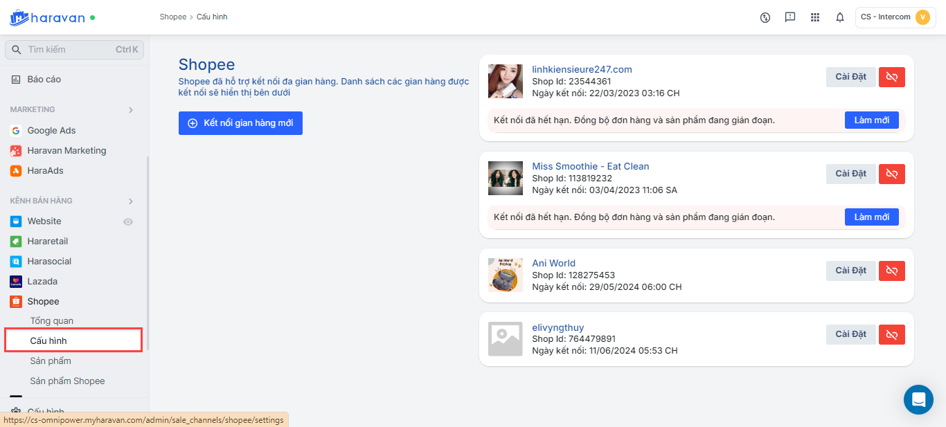 - Bạn vào Cấu hình kênh sàn TMĐT và chọn gian hàng muốn tắt đồng bộ giá