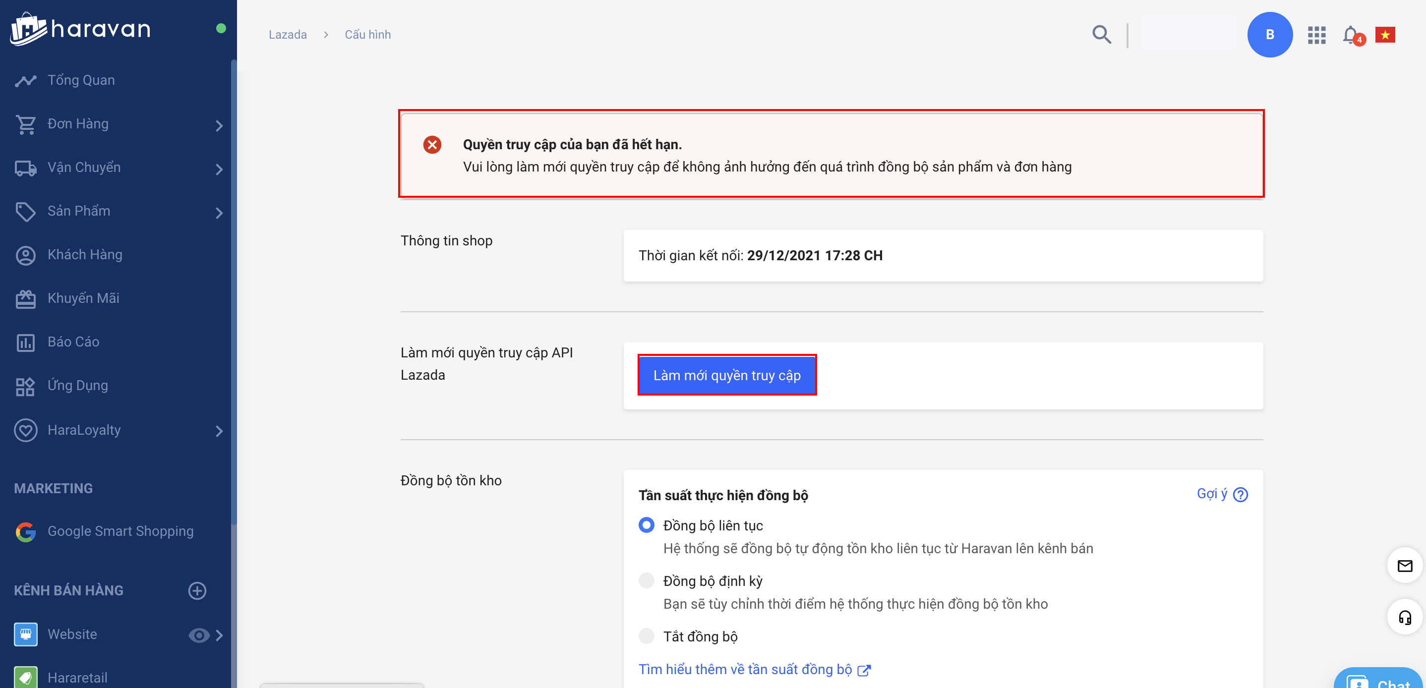 Đầu tiên, nhà bán hàng cần kiểm tra trong cấu hình kênh Lazada xem quyền truy cập kết nối API còn thời hạn không. Khi hết hạn truy cập, hệ thống sẽ có thông báo Quyền truy cập đã hết hạn.
