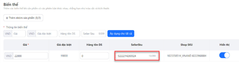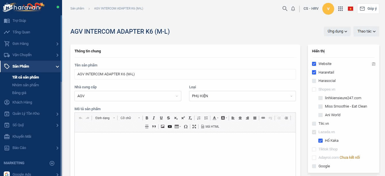 Giải pháp Bạn cần thao tác cập nhật đồng bộ lại. Cách cập nhật như sau: Truy cập trang chi tiết sản phẩm trên Lazada và bấm cập nhật sản phẩm, sau đó vào chi tiết sản phẩm trên Haravan → ở mục Hiển thị, ban bấm bỏ chọn kênh Lazada và chọn Cập nhật >> Sau đó bạn tiếp tục chọn lại kênh Lazada và bấm Cập nhật lại.