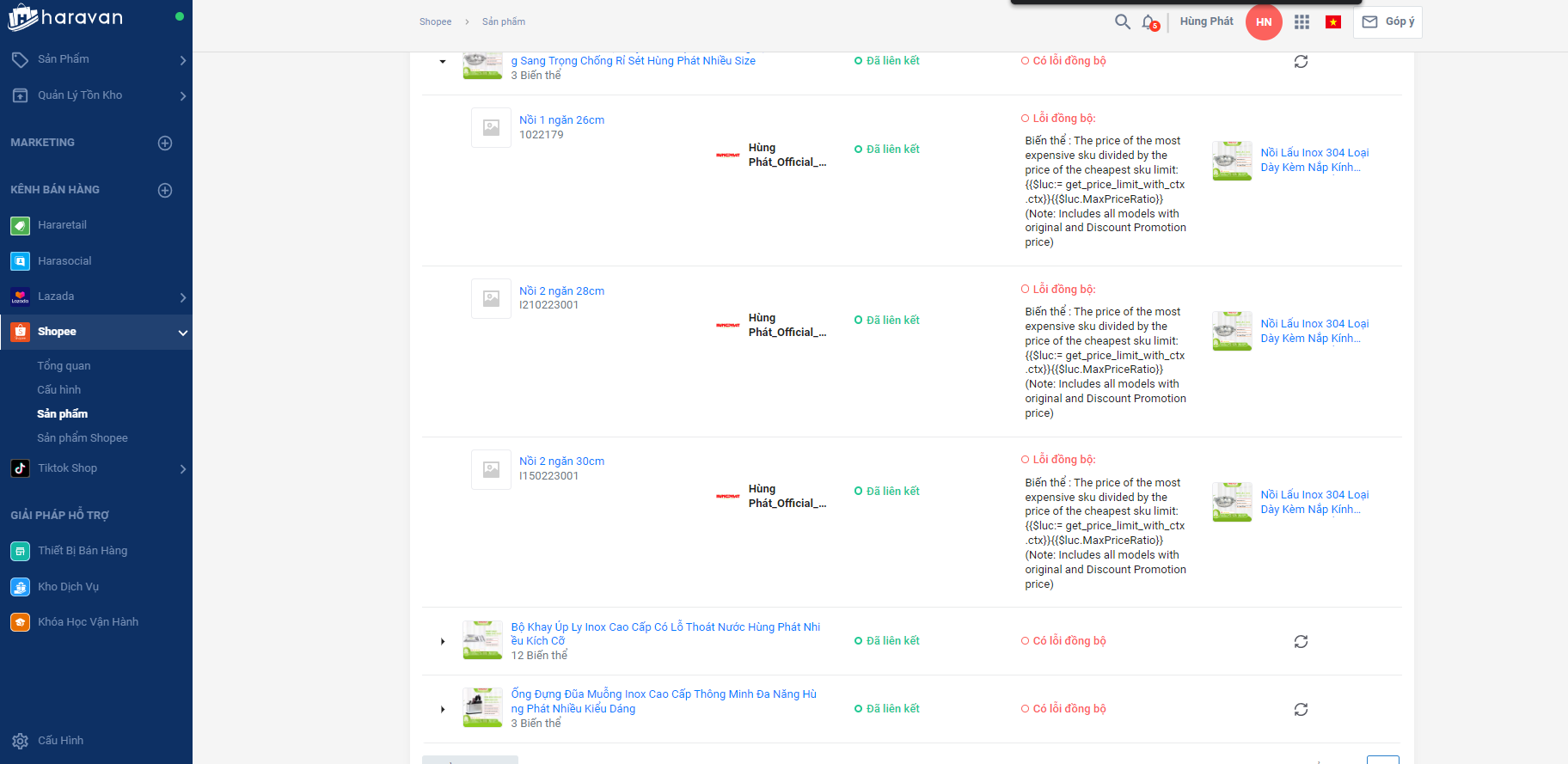 Vấn đề: Khi thực hiện liên kết sản phẩm giữa Haravan và Shopee, nhà bán gặp lỗi " Biến thể: The price of the most expensive sku divided by the price of the cheapest sku limit :"There was an error rendering this math block. KaTeX parse error: Expected 'EOF&...."