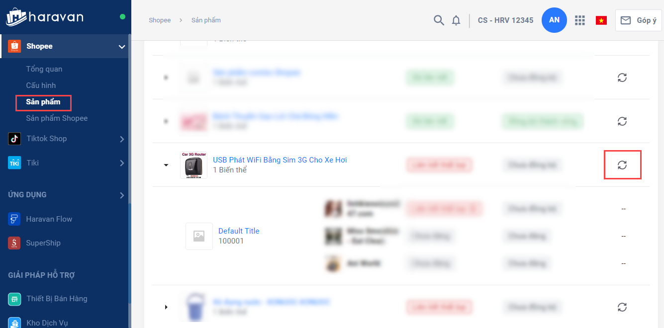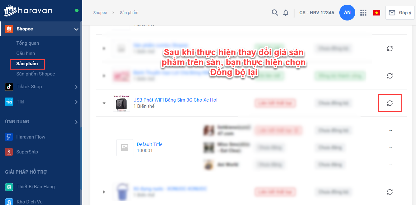 2. Chọnnút Đồng bộ lại** cạnh sản phẩm bị lỗi trong **tab Sản phẩm**