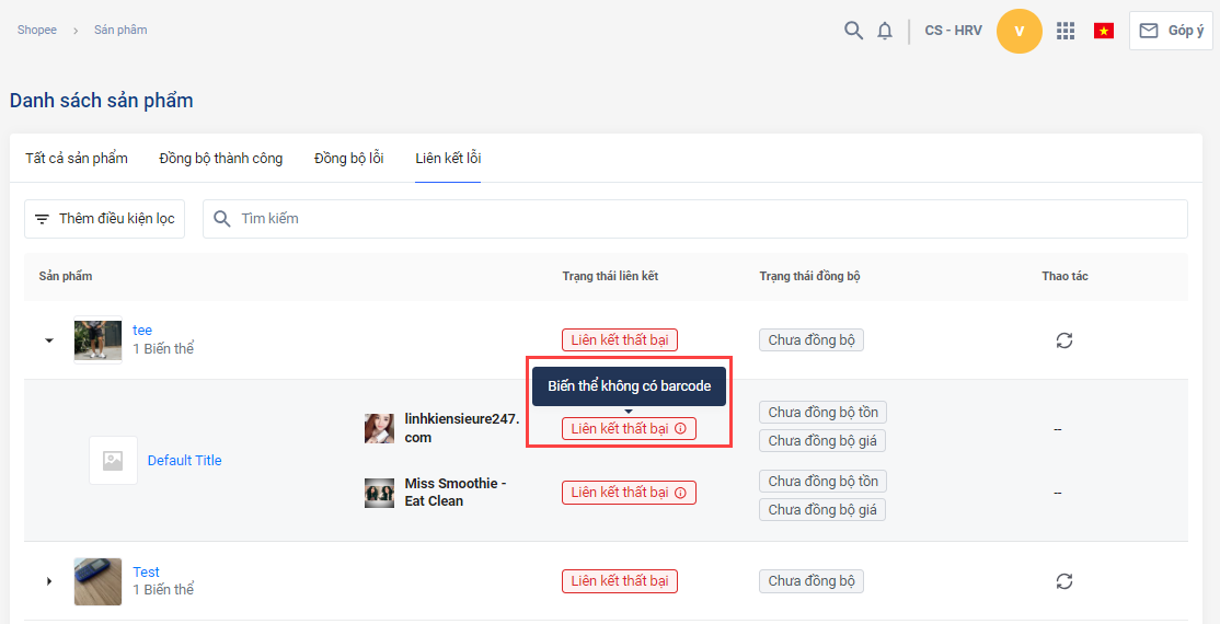 Để xem lỗi liên kết, bạn vào Shopee -> chọn Sản phẩm -> chọn mục Lỗi đồng bộ