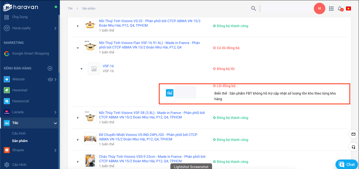 Sau khi thực hiện đồng bộ sản phẩm, hệ thống báo lỗi "Sản phẩm FBT không hỗ trợ cập nhật số lượng tồn kho theo từng kho hàng"
