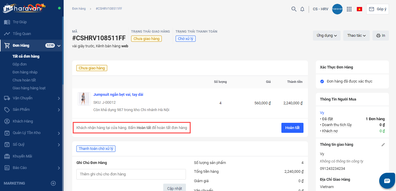 Khi khách chọn Nhận tại cửa hàng, đơn hàng sẽ không có nút giao hàng mà chỉ có nút Hoàn tất.