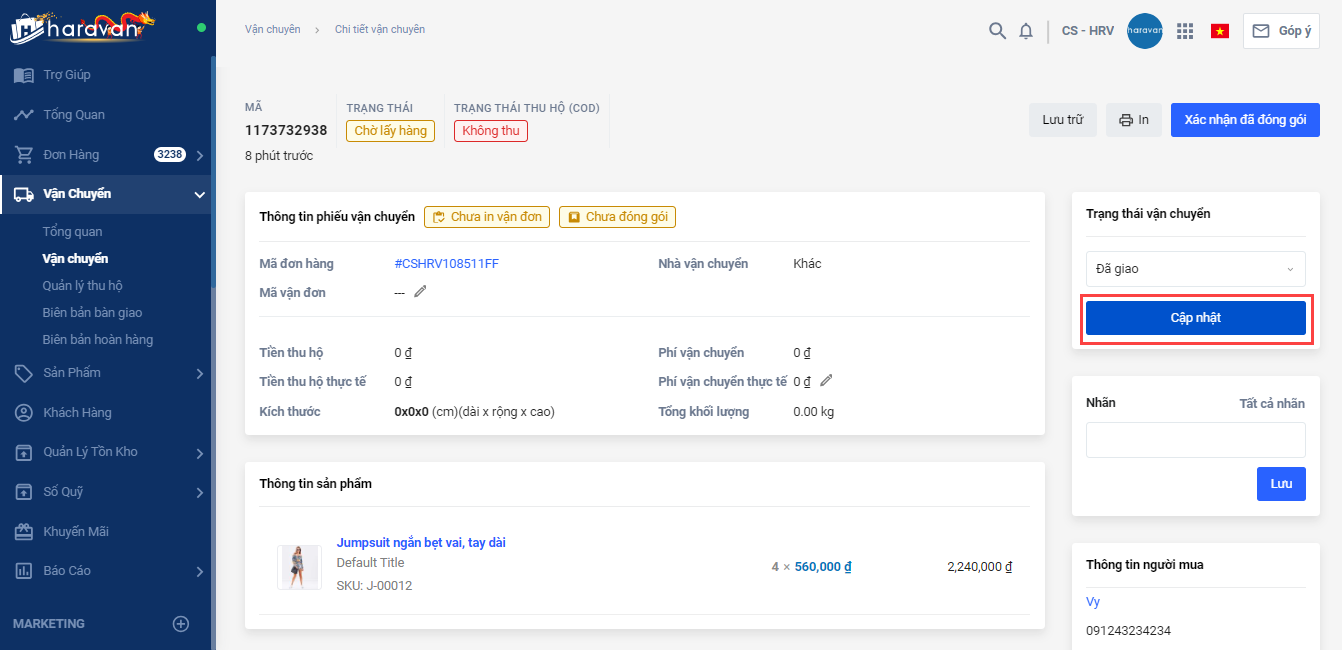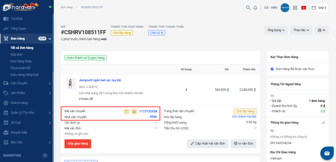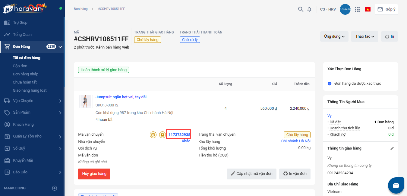 Sau khi chọn Hoàn tất, hệ thống sẽ tự tạo một vận đơn với nhà vận chuyển Khác. Lúc này tồn kho của sản phẩm mới được trừ đi